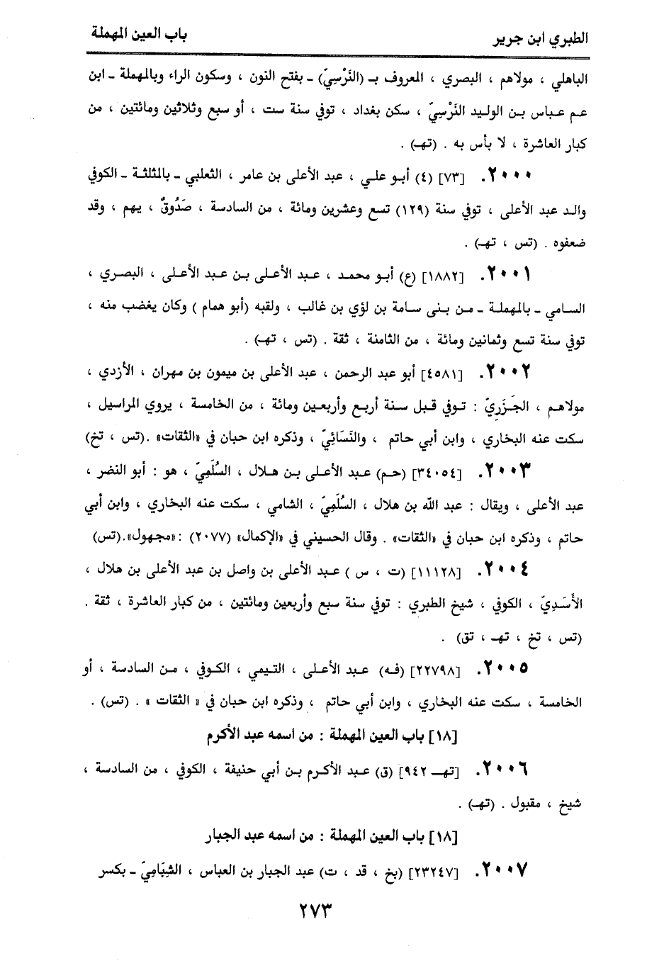2000 - [73] (4) أبو علي، عبد الأعلى بن عامر، الثعلبي - بالمثلثة - الكوفي، والد عبد الأعلى، توفي سنة (129) تسع وعشرين ومائة، من السادسة، صدوق، يهم، وقد ضعفوه. (تس، تهـ).
