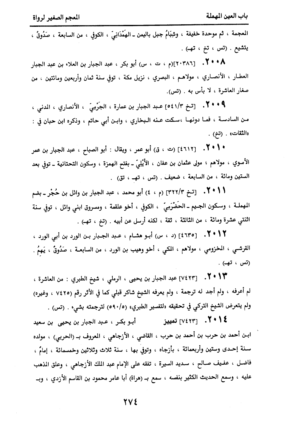 2009 - [تخ 3/ 541] عبد الجبار بن عمارة، الجرمي، الأنصاري، المدني، من السادسة فما دونها، سكت عنه البخاري وابن أبي حاتم، وذكره ابن حبان في " الثقات ". (تخ).