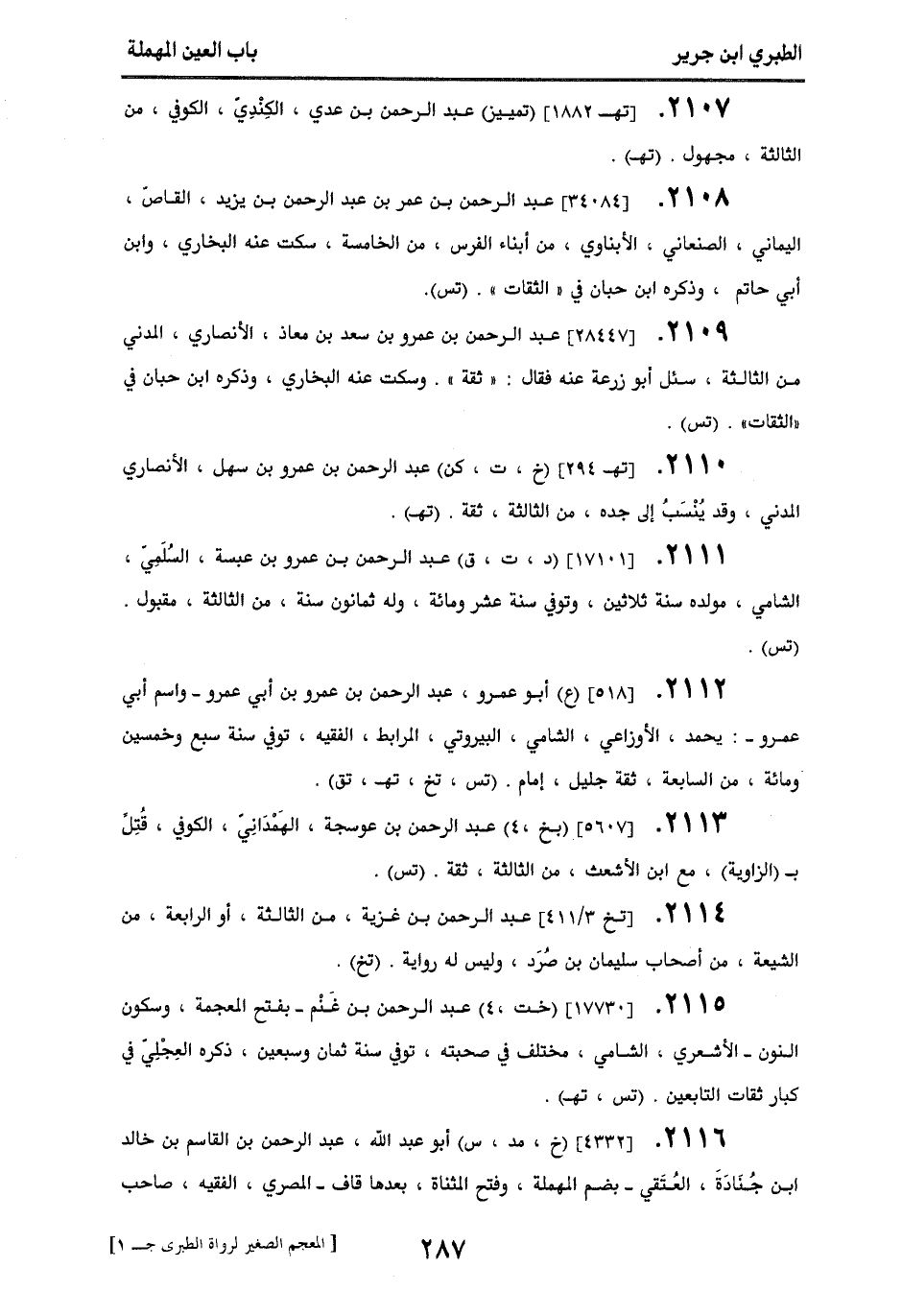 2108 - [34084] عبد الرحمن بن عمر بن عبد الرحمن بن يزيد، القاص، اليماني، الصنعاني، الأبناوي، من أبناء الفرس، من الخامسة، سكت عنه البخاري وابن أبي حاتم، وذكره ابن حبان في " الثقات ". (تس).