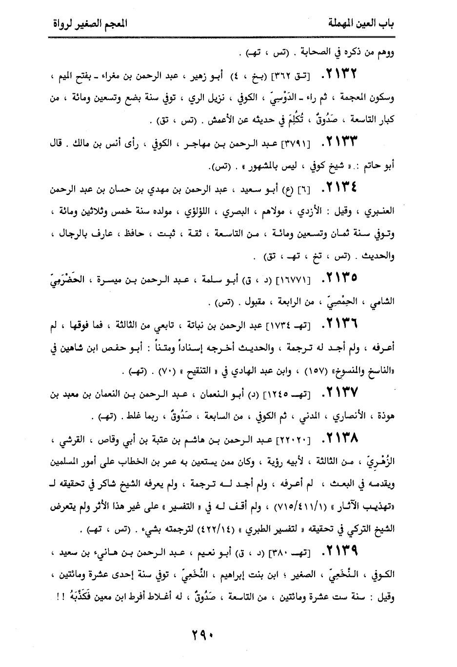 2134 - [6] (ع) أبو سعيد، عبد الرحمن بن مهدي بن حسان بن عبد الرحمن العنبري، وقيل: الأزدي، مولاهم، البصري، اللؤلؤي، مولده سنة خمس وثلاثين ومائة، وتوفي سنة ثمان وتسعين ومائة، من التاسعة، ثقة، ثبت، حافظ، عارف بالرجال والحديث. (تس، تخ، تهـ، تق).