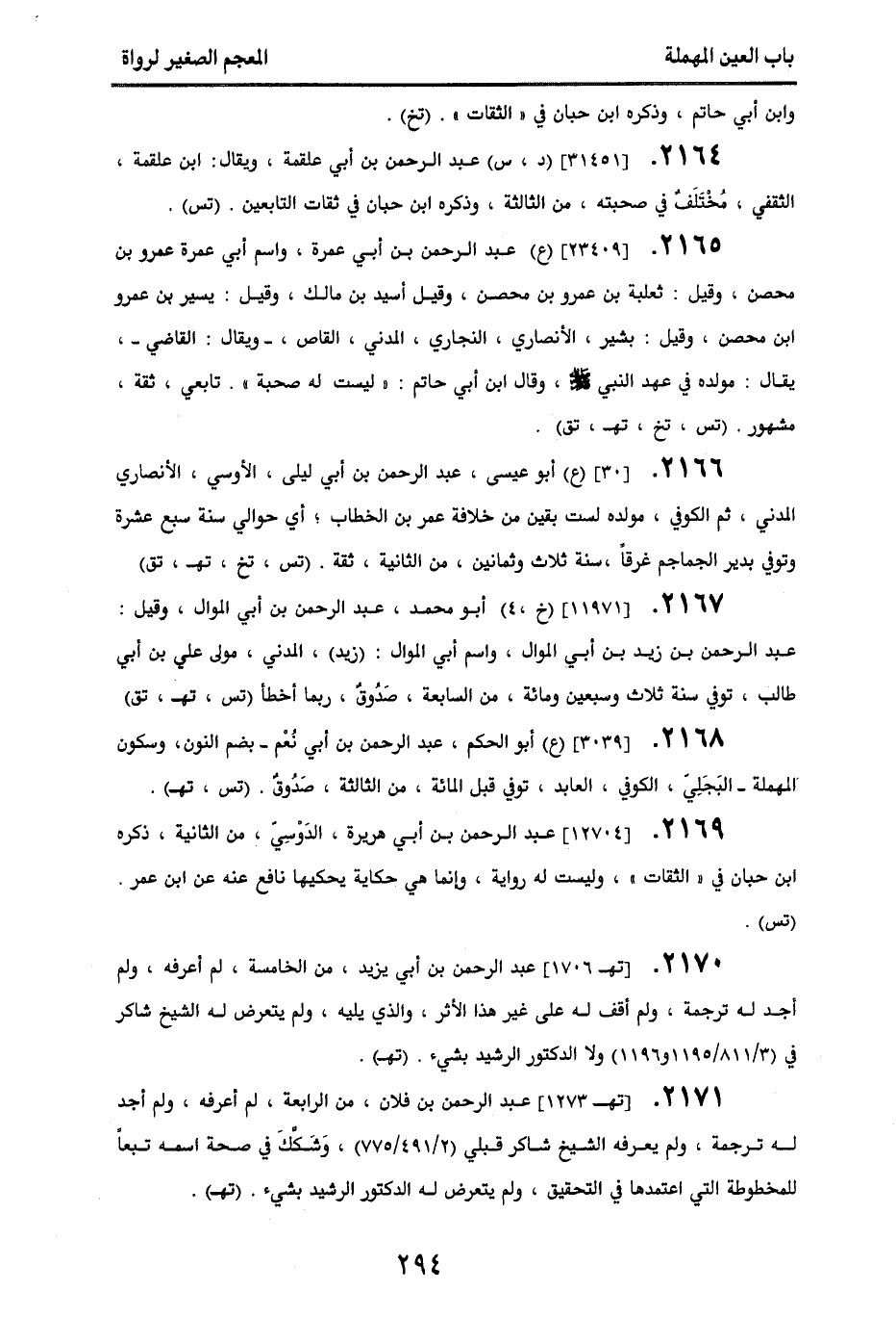 2171 - [تهـ 1273] عبد الرحمن بن فلان، من الرابعة، لم أعرفه، ولم أجد له ترجمة، ولم يعرفه الشيخ شاكر قبلي (2/ 491\ 775)، وشكك في صحة اسمه تبعا للمخطوطة التي اعتمدها في التحقيق، ولم يتعرض له الدكتور الرشيد بشيء. (تهـ).