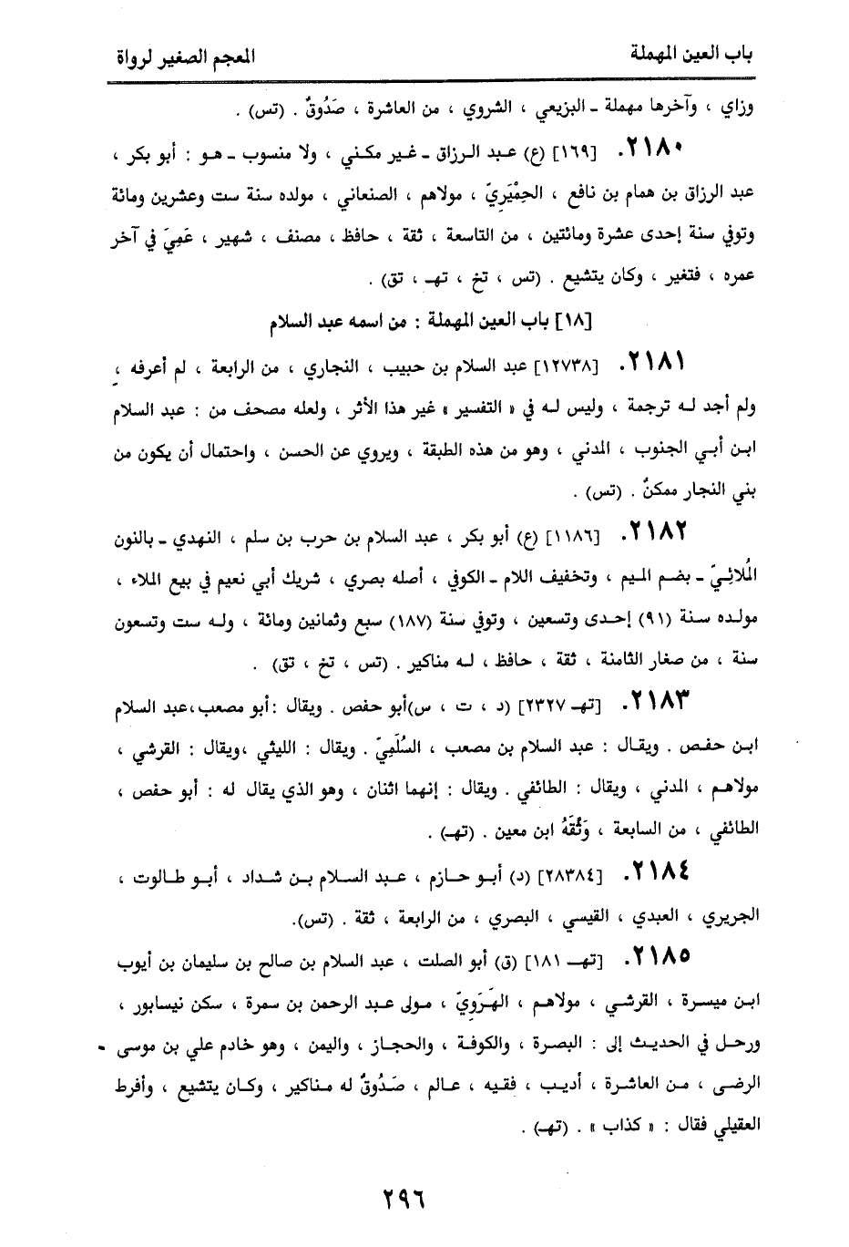 2180 - [169] (ع) عبد الرزاق - غير مكني ولا منسوب - هو أبو بكر، عبد الرزاق بن همام بن نافع، الحميري، مولاهم، الصنعاني، مولده سنة ست وعشرين ومائة، وتوفي سنة إحدى عشرة ومائتين، من التاسعة، ثقة، حافظ، مصنف، شهير، عمي في آخر عمره فتغير، وكان يتشيع. (تس، تخ، تهـ، تق).