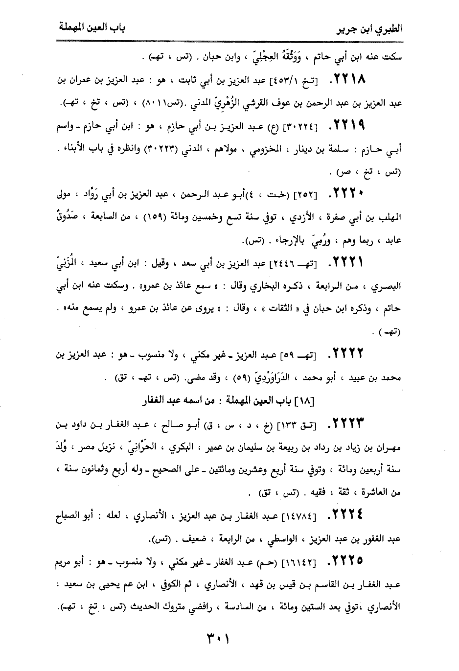 2222 - [تهـ 59] عبد العزيز - غير مكني ولا منسوب - هو عبد العزيز بن محمد بن عبيد، أبو محمد، الدراوردي (59)، وقد مضى. (تس، تهـ، تق).