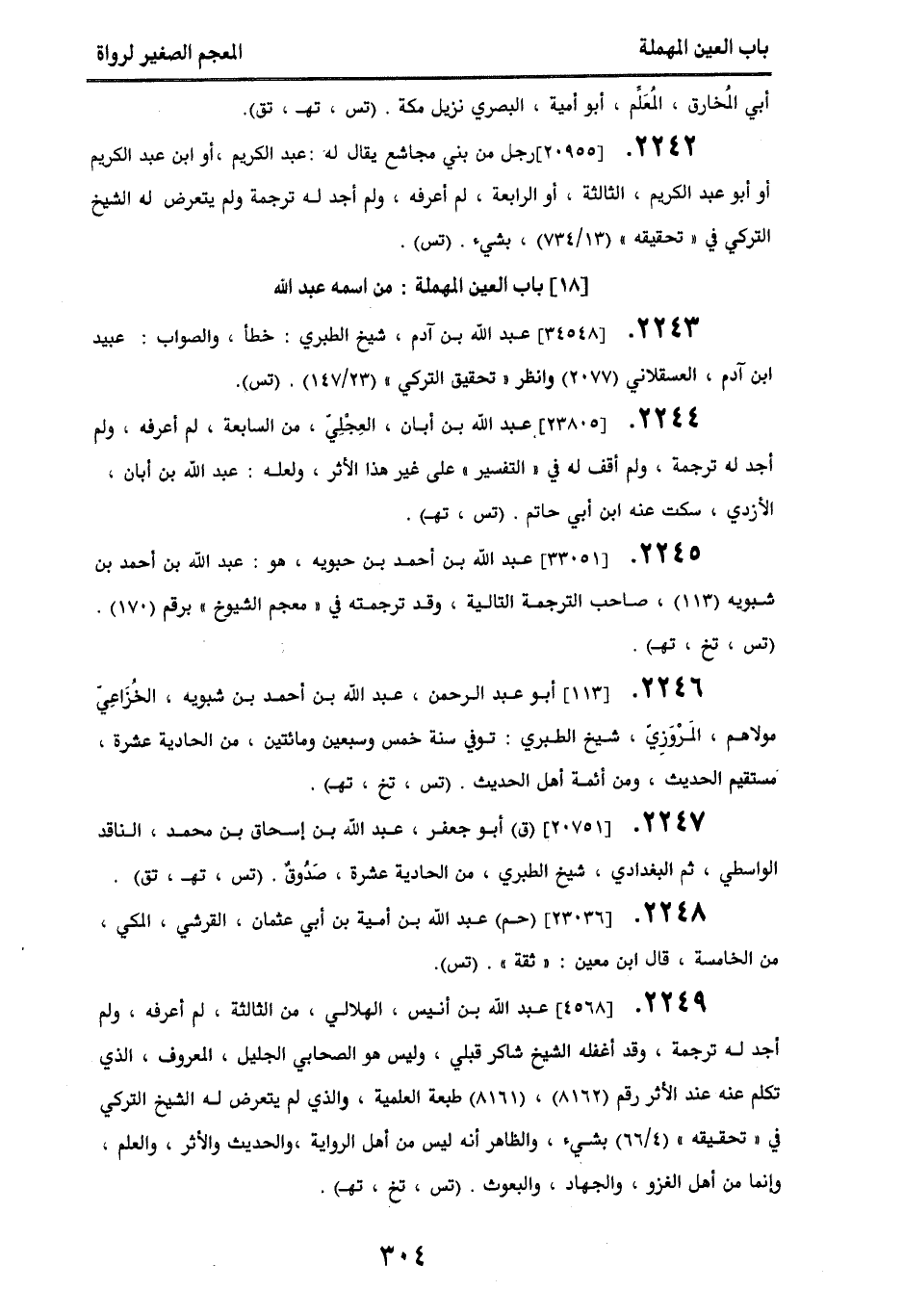 2242 - [20955] رجل من بني مجاشع يقال له: عبد الكريم، أو ابن عبد الكريم، أو أبو عبد الكريم، الثالثة أو الرابعة، لم أعرفه، ولم أجد له ترجمة، ولم يتعرض له الشيخ التركي في " تحقيقه " (13/ 734) بشيء. (تس).