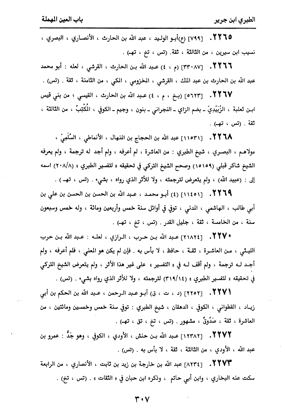 2268 - [11531] عبد الله بن الحجاج بن المنهال، الأنماطي، السلمي، مولاهم، البصري، شيخ الطبري، من العاشرة، لم أعرفه، ولم أجد له ترجمة، ولم يعرفه الشيخ شاكر قبلي (15159) وصحح الشيخ التركي في تحقيقه " لتفسير الطبري " (8/ 208) اسمه إلى (عبيد الله)، ولم يتعرض لترجمته ولا للأثر الذي رواه بشيء. (تس، تهـ).