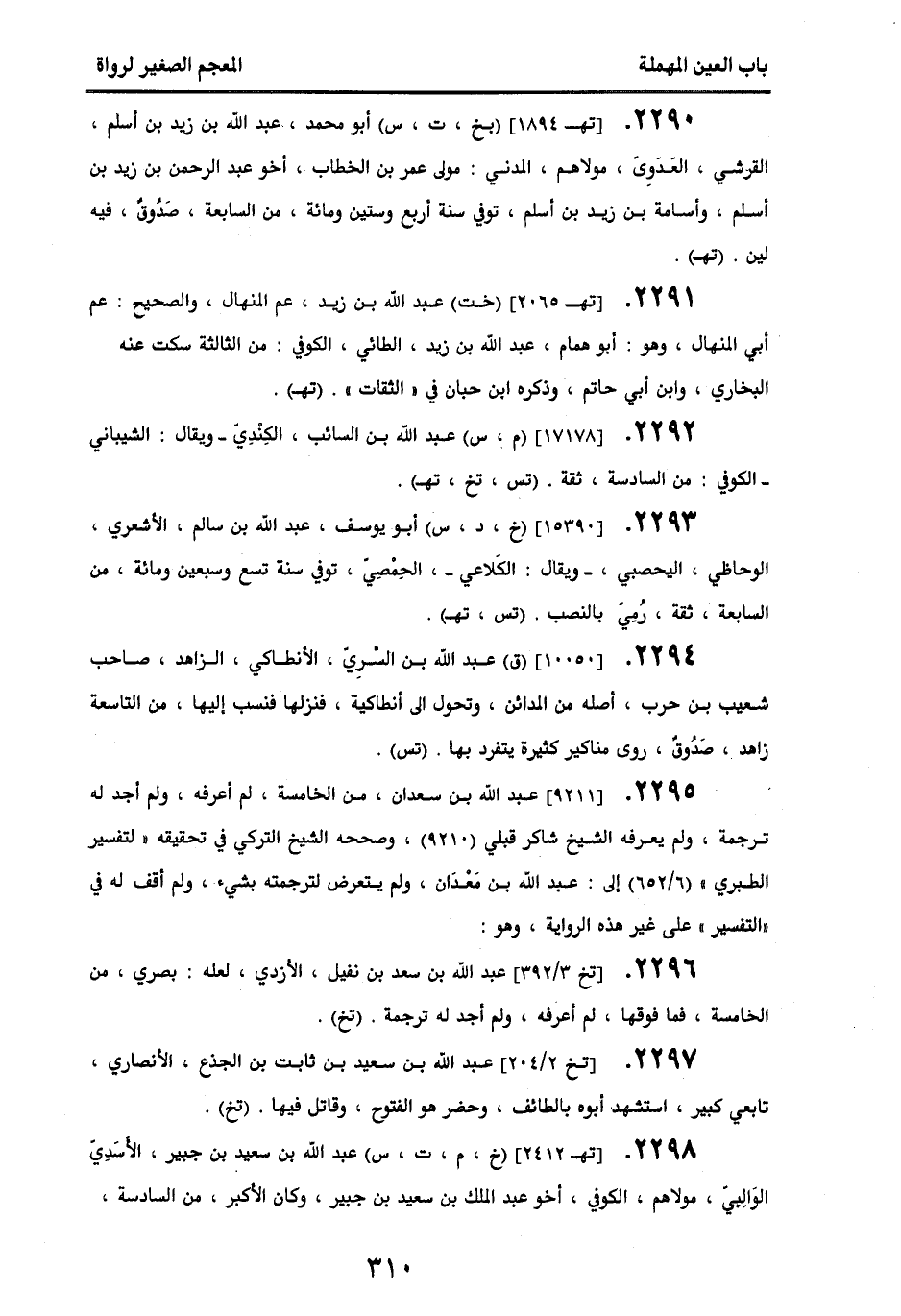 2290 - [تهـ 1894] (بخ، ت، س) أبو محمد، عبد الله بن زيد بن أسلم، القرشي، العدوي، مولاهم، المدني، مولى عمر بن الخطاب، أخو عبد الرحمن بن زيد بن أسلم، وأسامة بن زيد بن أسلم، توفي سنة أربع وستين ومائة، من السابعة، صدوق، فيه لين. (تهـ).
