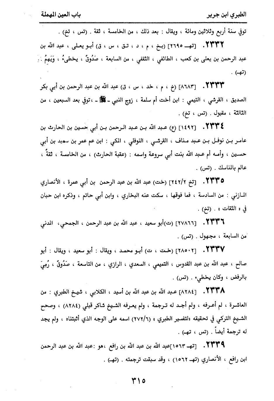 2332 - [تهـ 2695] (بخ، م، د، تق، س، ق) أبو يعلى، عبد الله بن عبد الرحمن بن يعلى بن كعب، الطائفي، الثقفي، من السابعة، صدوق، يخطئ، ويهم (تهـ).