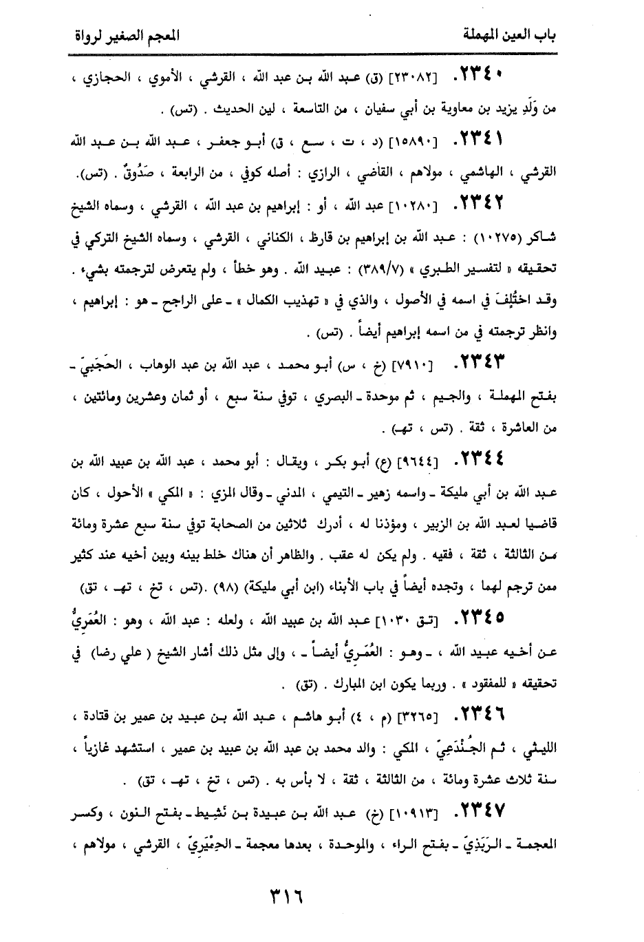 2345 - [تق 1030] عبد الله بن عبيد الله، ولعله عبد الله، وهو العمري، عن أخيه عبيد الله - وهو العمري أيضا -، وإلى مثل ذلك أشار الشيخ (علي رضا) في تحقيقه " للمفقود " وربما يكون ابن المبارك. (تق).