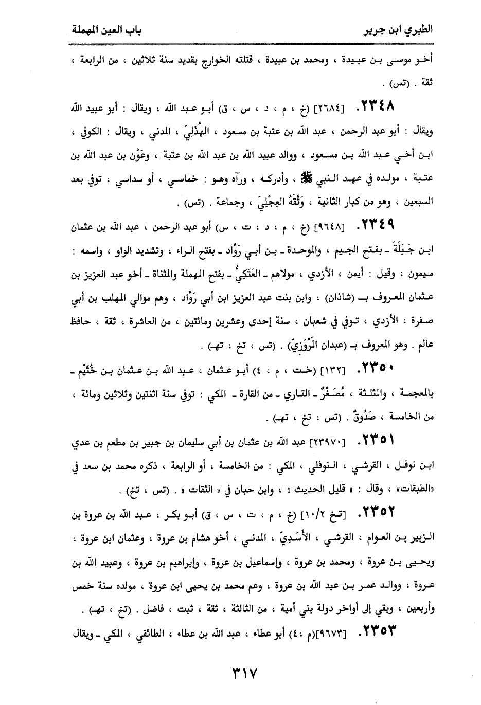 2349 - [9648] (خ، م، د، ت، س) أبو عبد الرحمن، عبد الله بن عثمان بن جبلة - بفتح الجيم والموحدة - ابن أبي رواد - بفتح الراء وتشديد الواو، واسمه: ميمون، وقيل: أيمن، الأزدي، مولاهم، العتكي - بفتح المهملة والمثناة - أخو عبد العزيز بن عثمان المعروف بـ (شاذان)، وابن بنت عبد العزيز بن أبي رواد، وهم موالي المهلب بن أبي صفرة، الأزدي، توفي في شعبان، سنة إحدى وعشرين ومائتين، من العاشرة، ثقة، حافظ، عالم، وهو المعروف بـ (عبدان المروزي). (تس، تخ، تهـ).
