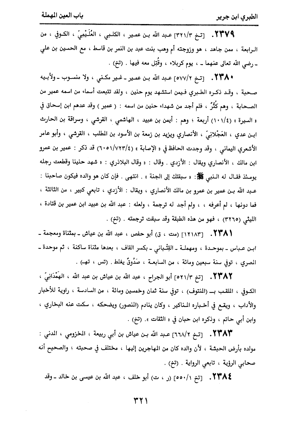 2379 - [تخ 3/ 321] عبد الله بن عمير، الكلبي، العليمي، الكوفي، من الرابعة، ممن جاهد هو وزوجته أم وهب بنت عبد بن النمر بن قاسط مع الحسين بن علي - رضي الله تعالى عنهما - يوم كربلاء، وقتل معه فيها. (تخ).
