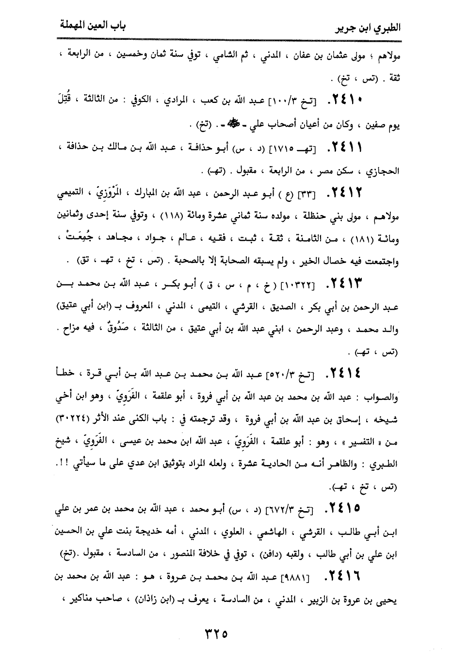 2412 - [33] (ع) أبو عبد الرحمن، عبد الله بن المبارك، المروزي، التميمي، مولاهم، مولى بني حنظلة، مولده سنة ثماني عشرة ومائة (118)، وتوفي سنة إحدى وثمانين ومائة (181)، من الثامنة، ثقة، ثبت، فقيه، عالم، جواد، مجاهد، جمعت واجتمعت فيه خصال الخير، ولم يسبقه الصحابة إلا بالصحبة. (تس، تخ، تهـ، تق).