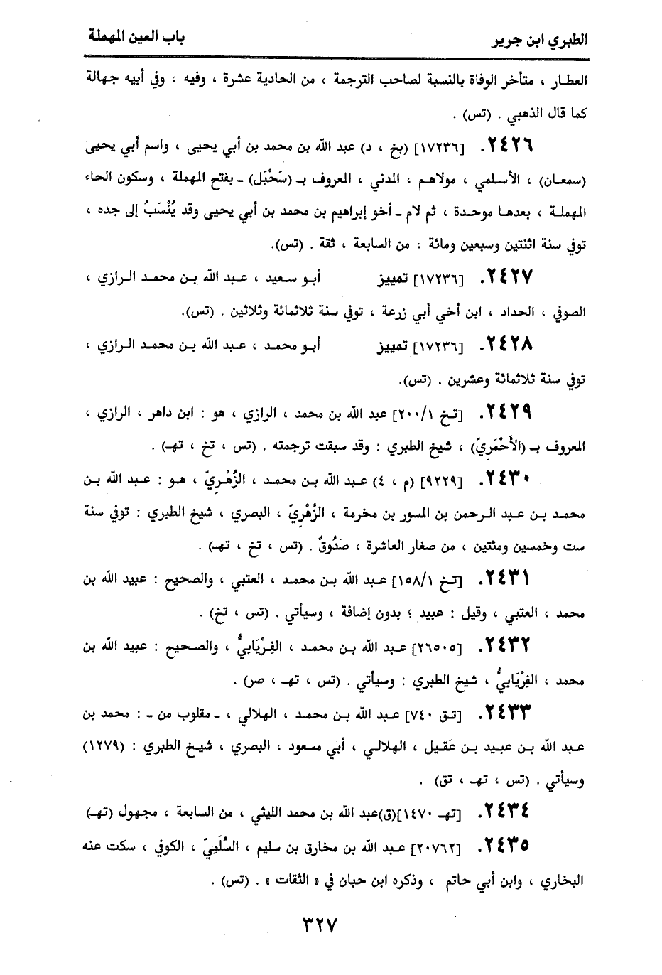 2432 - [26505] عبد الله بن محمد، الفريابي، والصحيح: عبيد الله بن محمد، الفريابي، شيخ الطبري، وسيأتي. (تس، تهـ، صر).