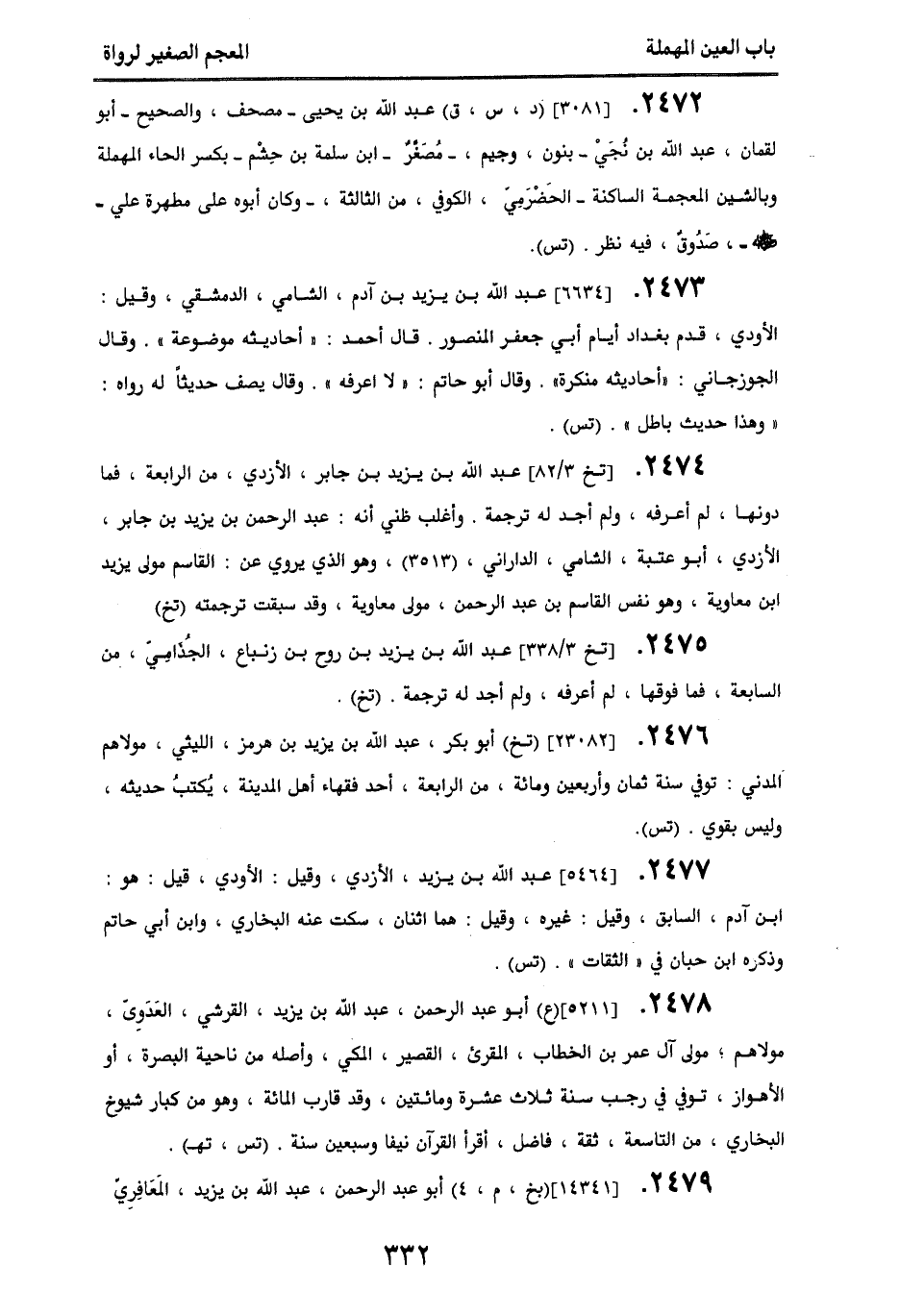 2474 - [تخ 3/ 82] عبد الله بن يزيد بن جابر، الأزدي، من الرابعة فما دونها، لم أعرفه، ولم أجد له ترجمة، وأغلب ظني أنه عبد الرحمن بن يزيد بن جابر الأزدي، أبو عتبة، الشامي، الداراني، (3513)، وهو الذي يروي عن القاسم مولى يزيد بن معاوية، وهو نفس القاسم بن عبد الرحمن مولى معاوية، وقد سبقت ترجمته. (تخ).