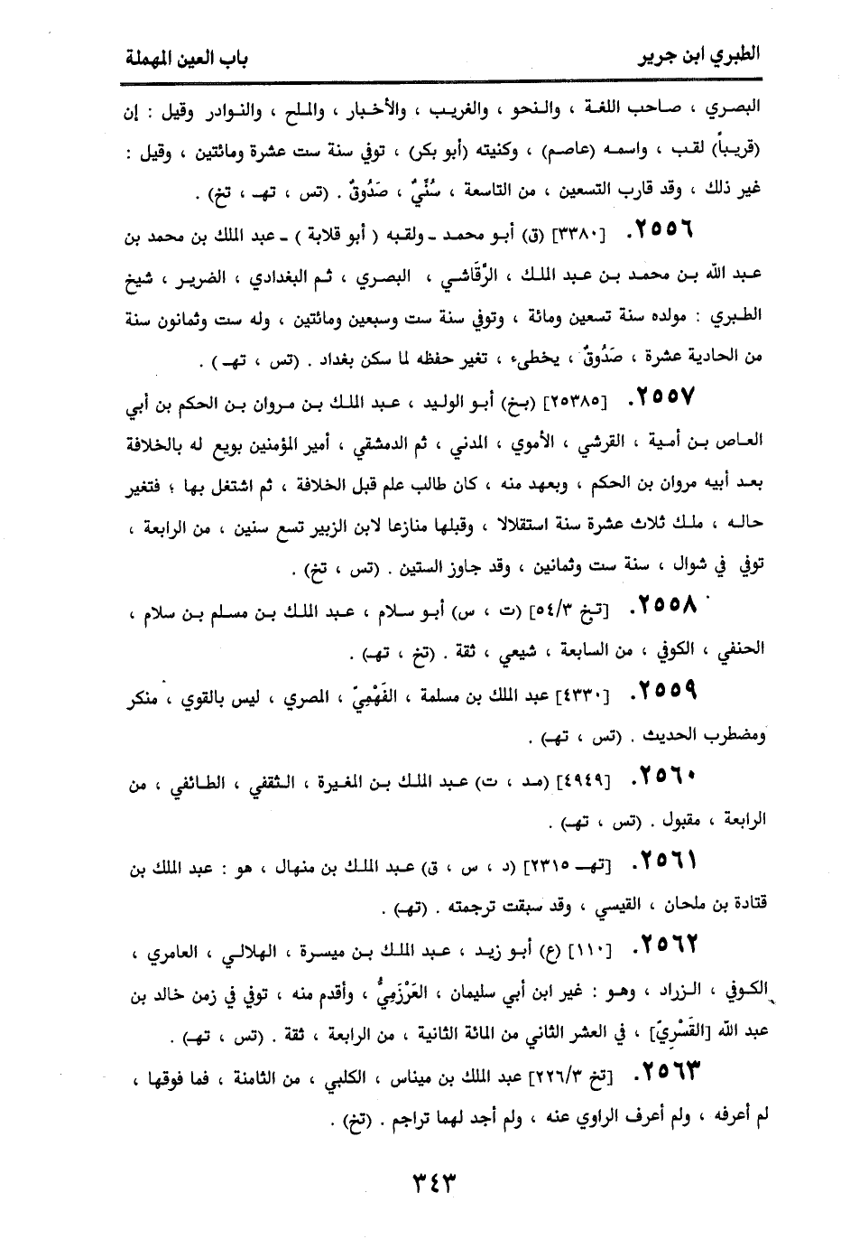 2557 - [25385] (بخ) أبو الوليد، عبد الملك بن مروان بن الحكم بن أبي العاص بن أمية، القرشي، الأموي، المدني، ثم الدمشقي، أمير المؤمنين بويع له بالخلافة بعد أبيه مروان بن الحكم، وبعهد منه، كان طالب علم قبل الخلافة، ثم اشتغل بها فتغير حاله، ملك ثلاث عشرة سنة استقلالا، وقبلها منازعا لابن الزبير تسع سنين، من الرابعة، توفي في شوال سنة ست وثمانين، وقد جاوز الستين. (تس، تخ).