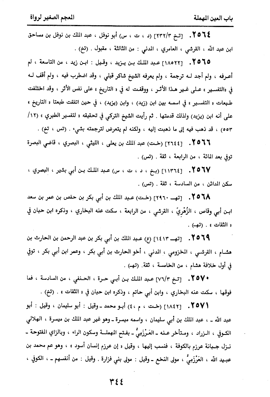 2568 - [تهـ 2960] (خت) عبد الملك بن أبي بكر بن حفص بن عمر بن سعد بن أبي وقاص، الزهري، القرشي، من الرابعة، سكت عنه البخاري، وذكره ابن حبان في " الثقات ". (تهـ).