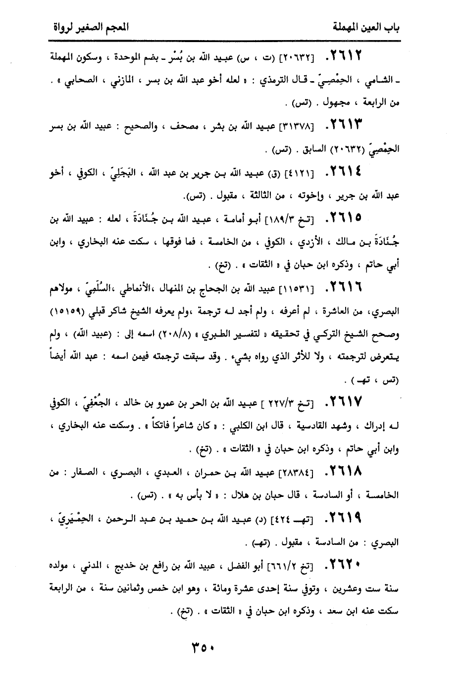 2618 - [28384] عبيد الله بن حمران، العبدي، البصري، الصفار، من الخامسة أو السادسة، قال حبان بن هلال: " لا بأس به ". (تس).