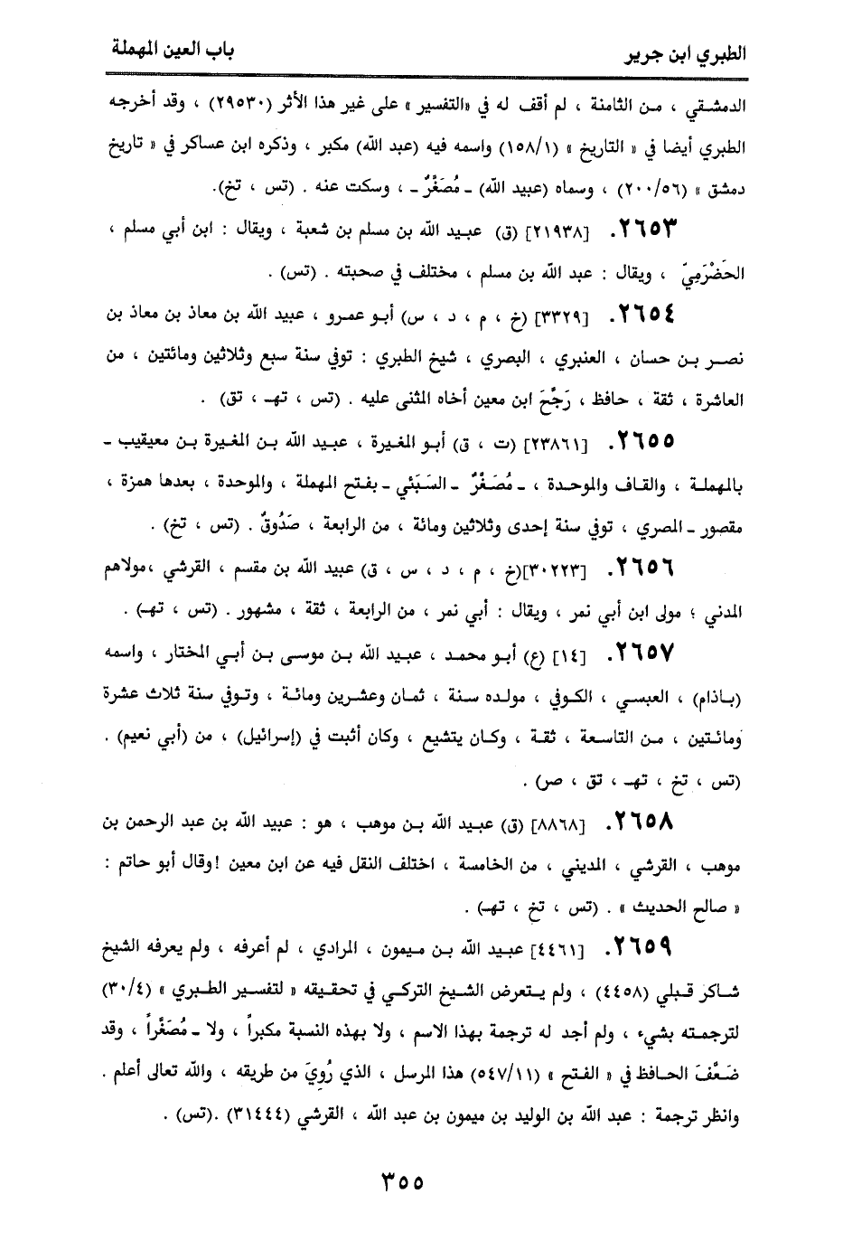 2659 - [4461] عبيد الله بن ميمون، المرادي، لم أعرفه، ولم يعرفه الشيخ شاكر قبلي (4458)، ولم يتعرض الشيخ التركي في تحقيقه " لتفسير الطبري " (4/ 30) لترجمته بشيء، ولم أجد له ترجمة بهذا الاسم، ولا بهذه النسبة مكبرا ولا مصغرا، وقد ضعف الحافظ في " الفتح " (11/ 547) هذا المرسل، الذي روي من طريقه، والله تعالى أعلم، وانظر ترجمته: عبد الله بن الوليد بن ميمون بن عبد الله، القرشي (31444). (تس).