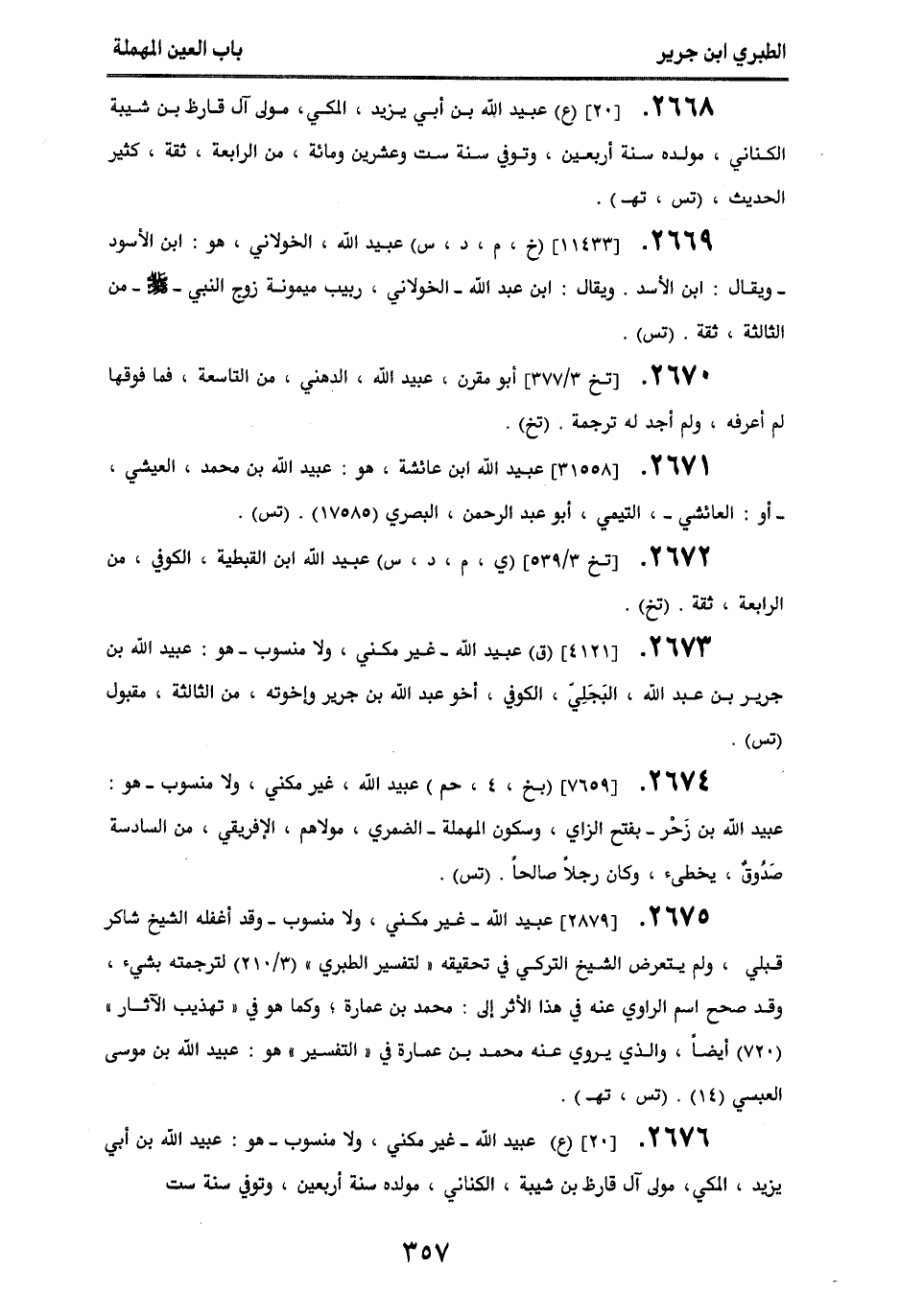 2676 - [20] (ع) عبيد الله - غير مكني ولا منسوب - هو عبيد الله بن أبي يزيد، المكي، مولى آل قارظ بن شيبة، الكناني، مولد سنة أربعين، وتوفي سنة ست