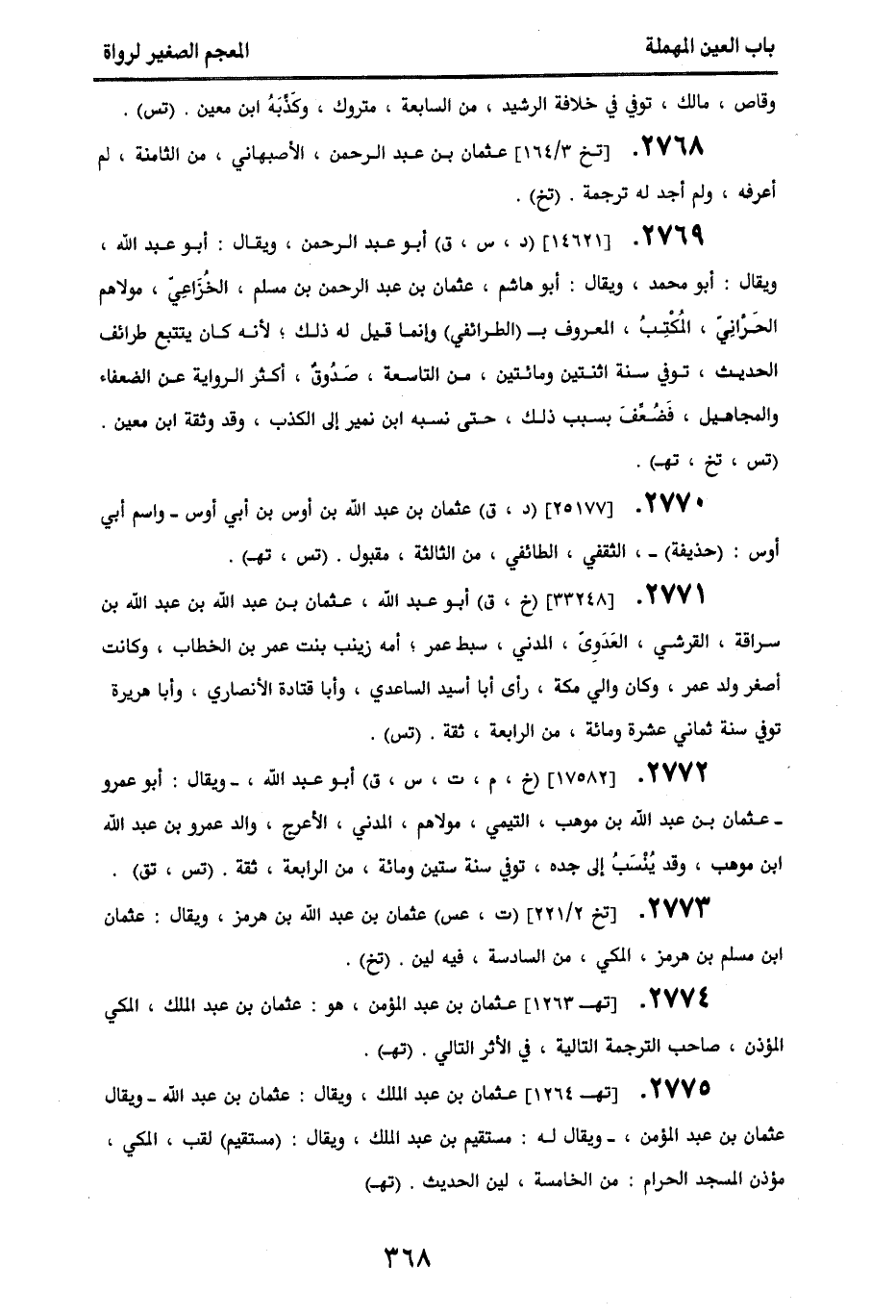 2774 - [تهـ 1263] عثمان بن عبد المؤمن، هو عثمان بن عبد الملك، المكي، المؤذن، صاحب الترجمة التالية في الأثر التالي. (تهـ).