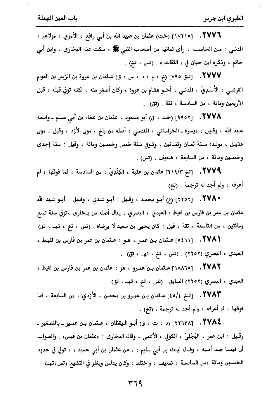 2776 - [17215] (خت) عثمان بن عبيد الله بن أبي رافع، الأموي، مولاهم، المدني، من الخامسة، رأى ثمانية من أصحاب النبي صلى الله عليه وسلم، سكت عنه البخاري وابن أبي حاتم، وذكره ابن حبان في " الثقات ". (تس، تخ).