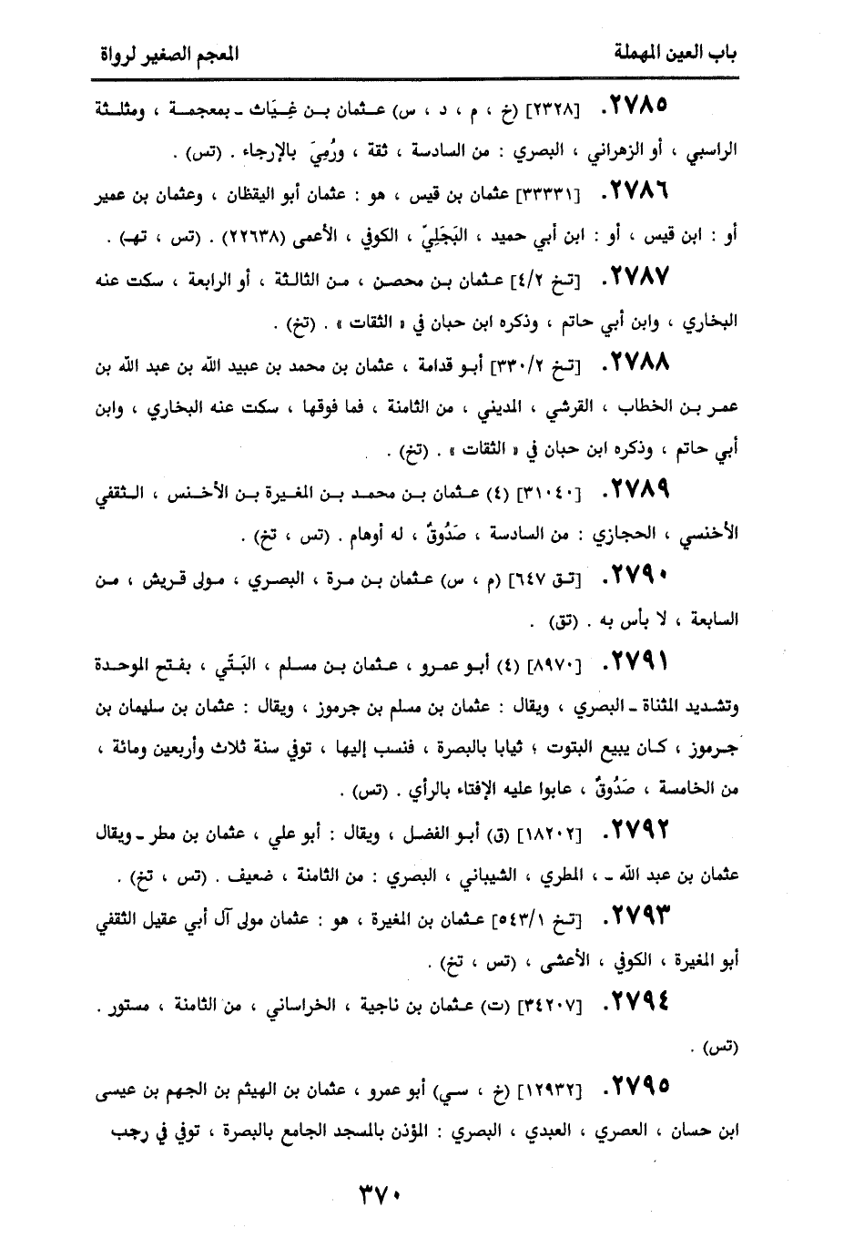 2785 - [2328] (خ، م، د، س) عثمان بن غياث - بمعجمة، ومثلثة - الراسبي، أو الزهراني، البصري، من السادسة، ثقة، ورمي بالإرجاء. (تس).