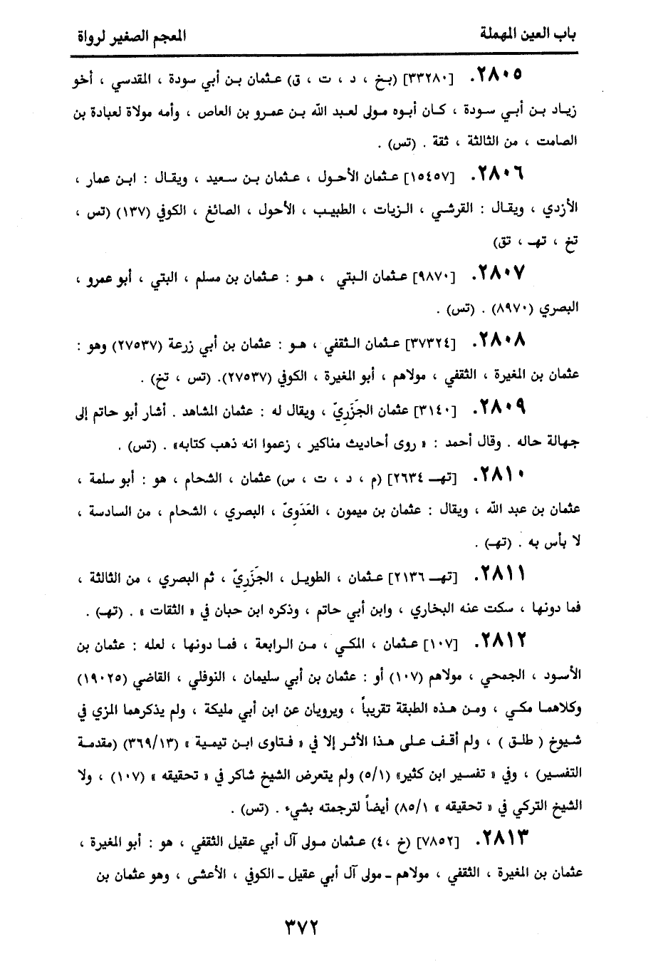 2806 - [15457] عثمان الأحول، عثمان بن سعيد، ويقال: ابن عمار، الأزدي، ويقال: القرشي، الزيات، الطبيب، الأحول، الصائغ، الكوفي (137) (تس، تخ، تهـ، تق).