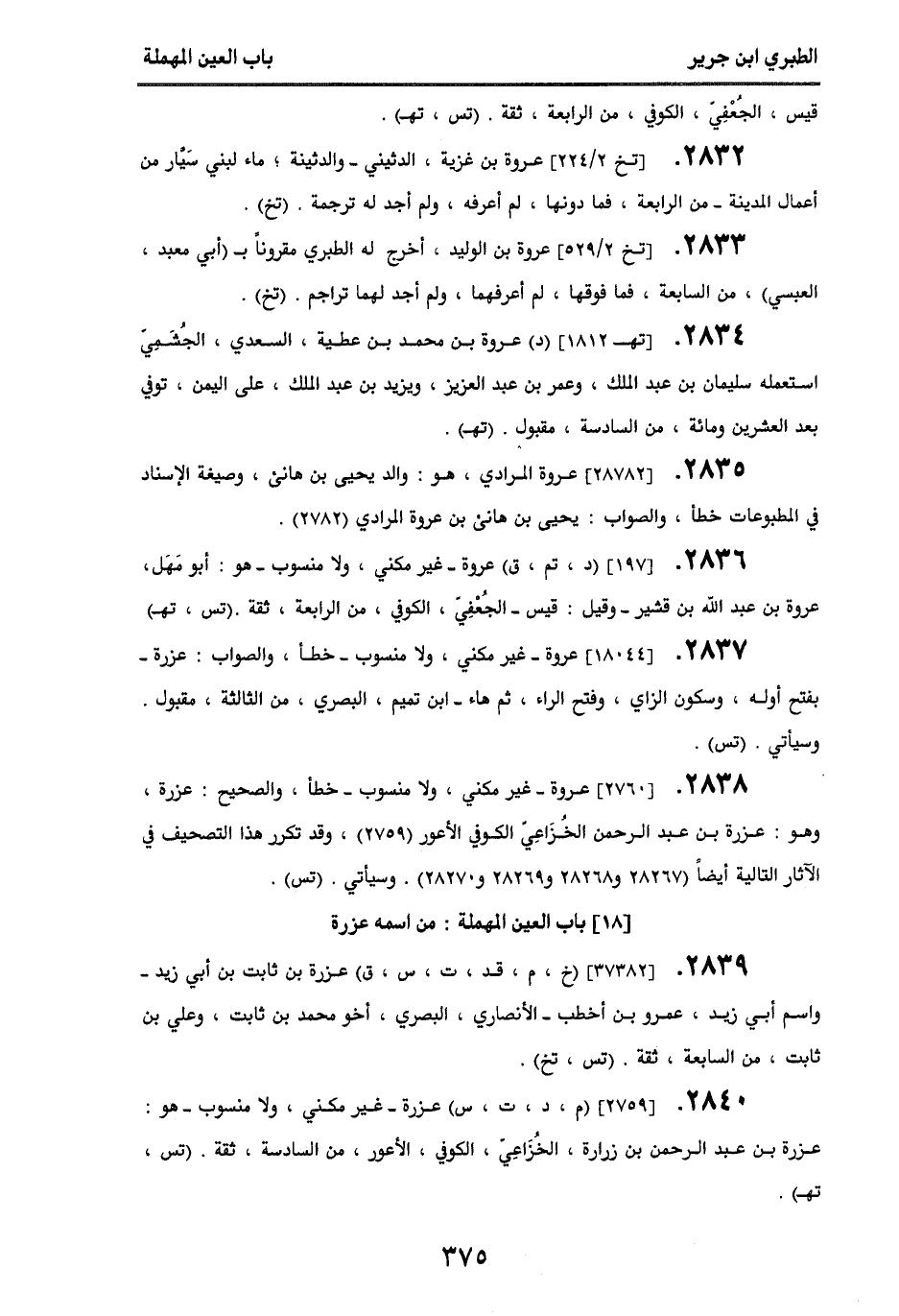 2837 - [18044] عروة - غير مكني ولا منسوب -، خطأ، والصواب: عزرة - بفتح أوله، وسكون الزاي، وفتح الراء، ثم هاء - ابن تميم، البصري، من الثالثة، مقبول، وسيأتي. (تس).