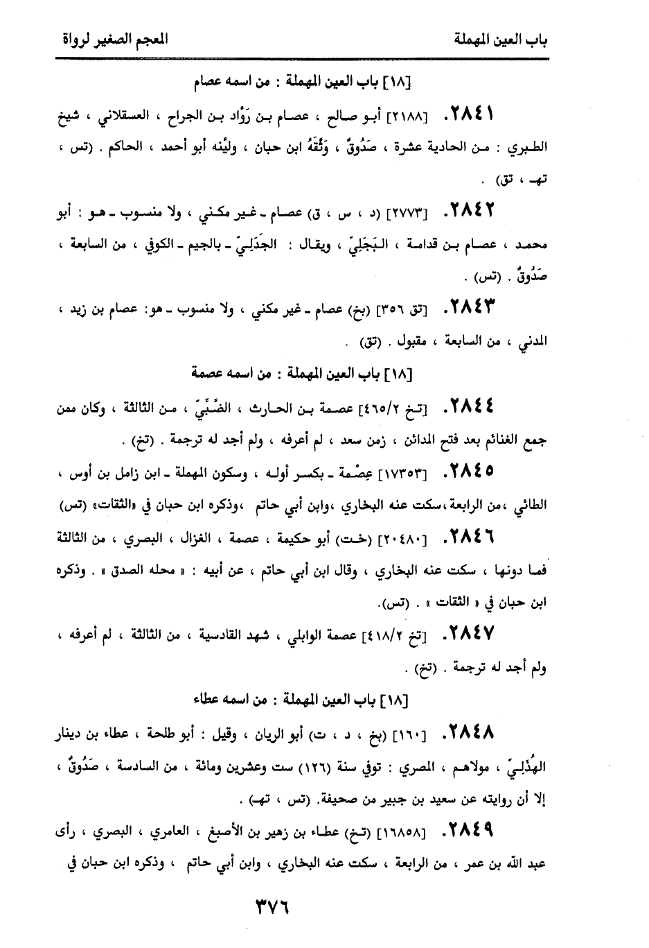 2841 - [2188] أبو صالح، عصام بن رواد بن الجراح، العسقلاني، شيخ الطبري، من الحادية عشرة، صدوق، وثقه ابن حبان، ولينه أبو أحمد الحاكم. (تس، تهـ، تق).