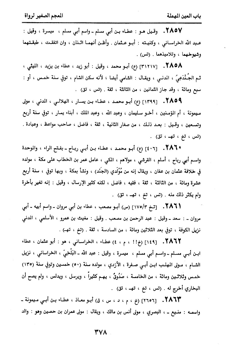 2862 - [149] (خ!!، م، 4) عطاء، الخراساني، هو أبو عثمان، عطاء بن أبي مسلم - واسم أبي مسلم ميسرة، وقيل: عبد الله - البلخي، الخراساني، نزيل الشام، مولى المهلب بن أبي صفرة، الأزدي، مولده سنة (50) خمسين، وتوفي سنة (135) خمس وثلاثين ومائة، من الخامسة، صدوق، يهم كثيرا، ويرسل، ويدلس، ولم يصح أن البخاري أخرج له. (تس، تخ، تهـ، تق).