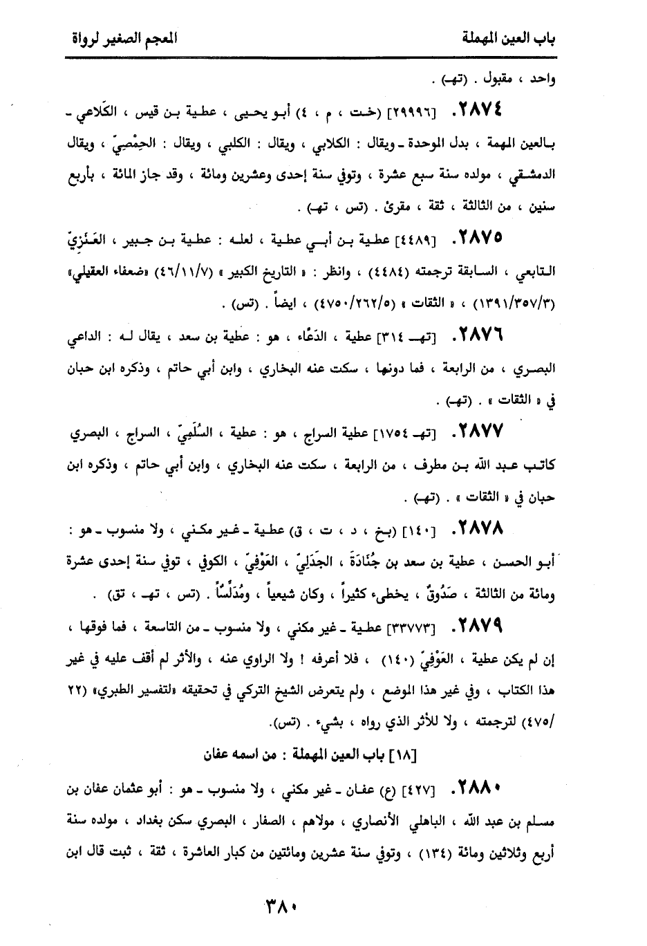 2876 - [تهـ 314] عطية، الدعاء، هو عطية بن سعد، يقال له: الداعي، البصري، من الرابعة فما دونها، سكت عنه البخاري وابن أبي حاتم، وذكره ابن حبان في " الثقات ". (تهـ).
