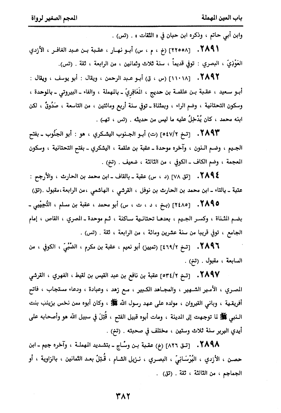 2897 - [تخ 2/ 534] عقبة بن نافع بن عبد القيس بن لقيط، الفهري، القرشي، المصري، الأمير الشهير، والمجاهد الكبير، مع زهد، وعبادة، ودعاء مستجاب، فاتح إفريقية، وباني القيروان، مولده على عهد رسول الله صلى الله عليه وسلم، وكان أبوه ممن نخس بزينب بنت النبي صلى الله عليه وسلم لما توجهت إلى المدينة، ومات أبوه قبيل الفتح، قتل في سبيل الله هو وأصحابه على أيدي البربر سنة ثلاث وستين، مختلف في صحبته. (تخ).