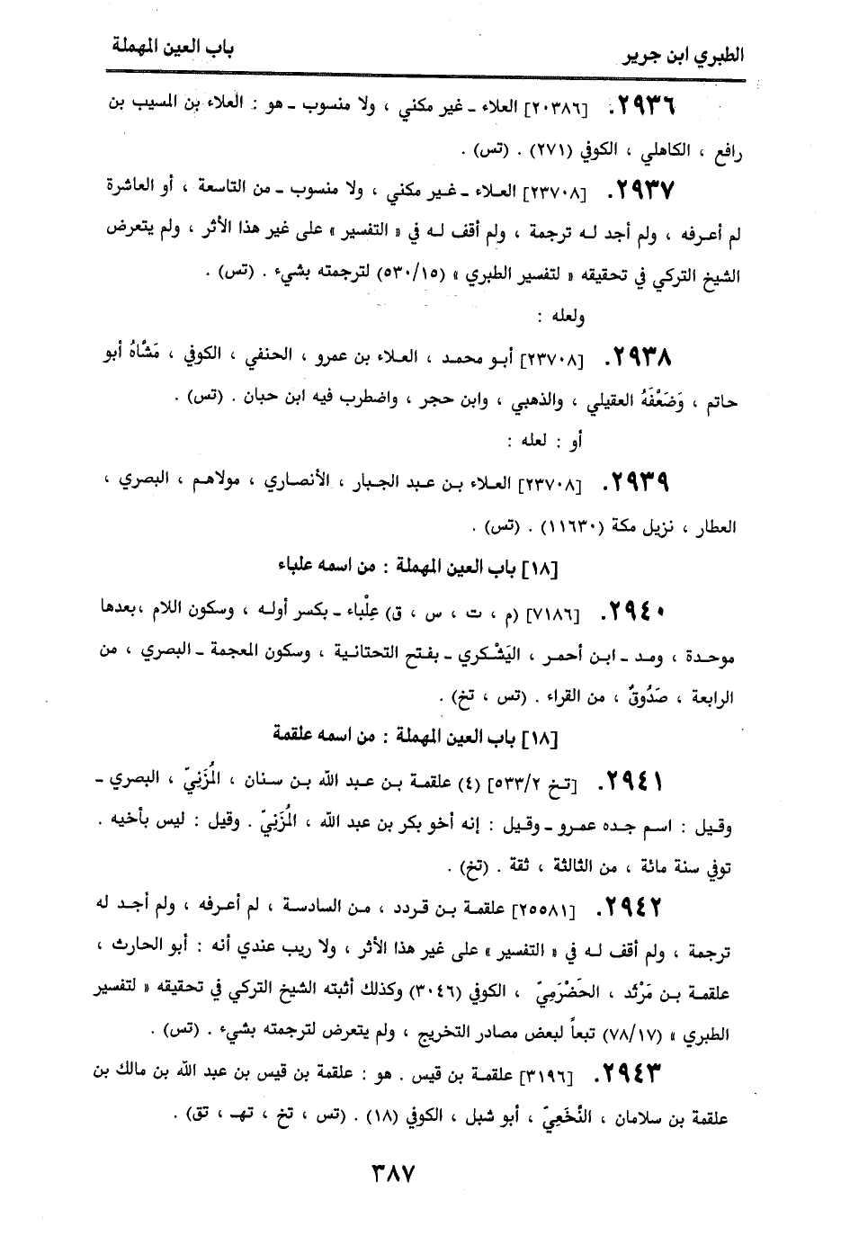 2937 - [23708] العلاء - غير مكني ولا منسوب - من التاسعة أو العاشرة، لم أعرفه، ولم أجد له ترجمة، ولم أقف له في " التفسير " على غير هذا الأثر، ولم يتعرض الشيخ التركي في تحقيقه " لتفسير الطبري " (15/ 530) لترجمته بشيء. (تس).