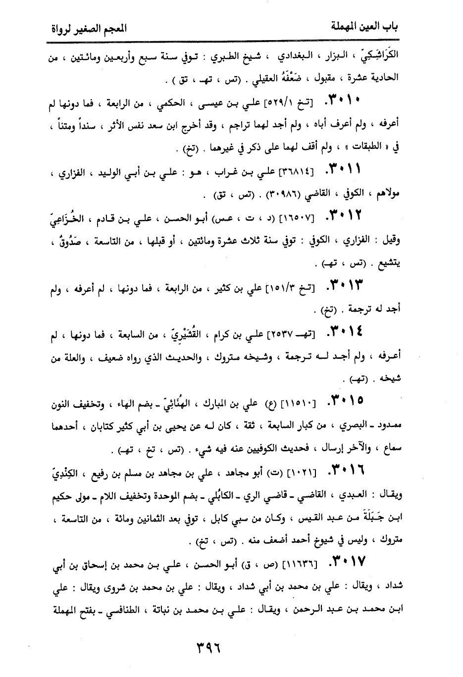 3010 - [تخ 1/ 529] علي بن عيسى، الحكمي، من الرابعة فما دونها، لم أعرفه، ولم أعرف أباه، ولم أجد لهما تراجم، وقد أخرج ابن سعد نفس الأثر سندا ومتنا في " الطبقات "، ولم أقف لهما على ذكر في غيرهما. (تخ).