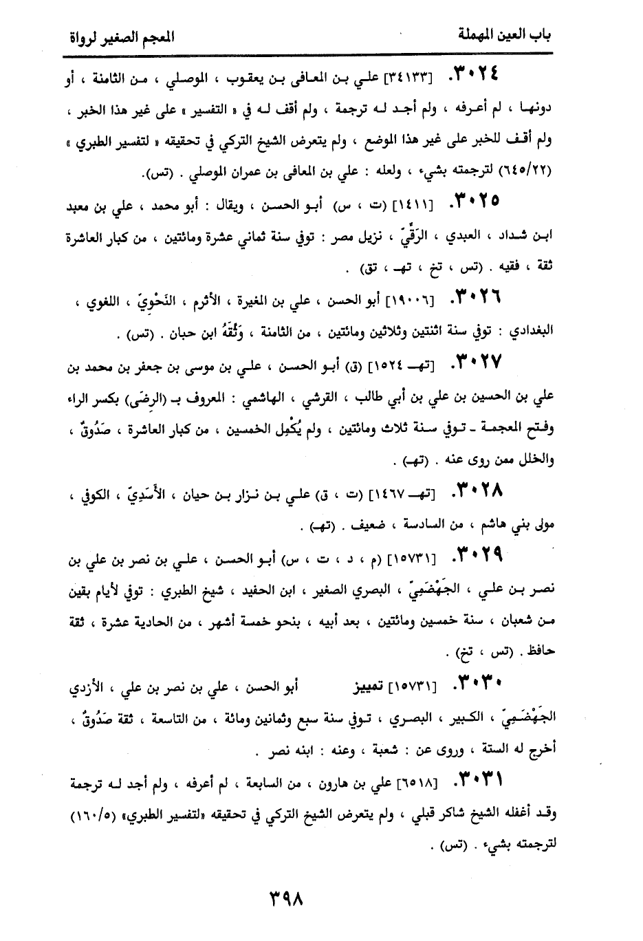 3027 - [تهـ 1524] (ق) أبو الحسن، علي بن موسى بن جعفر بن محمد بن علي بن الحسين بن علي بن أبي طالب، القرشي، الهاشمي، المعروف بـ (الرضى) - بكسر الراء وفتح المعجمة - توفي سنة ثلاث ومائتين، ولم يكمل الخمسين، من كبار العاشرة، صدوق، والخلل ممن روى عنه. (تهـ).