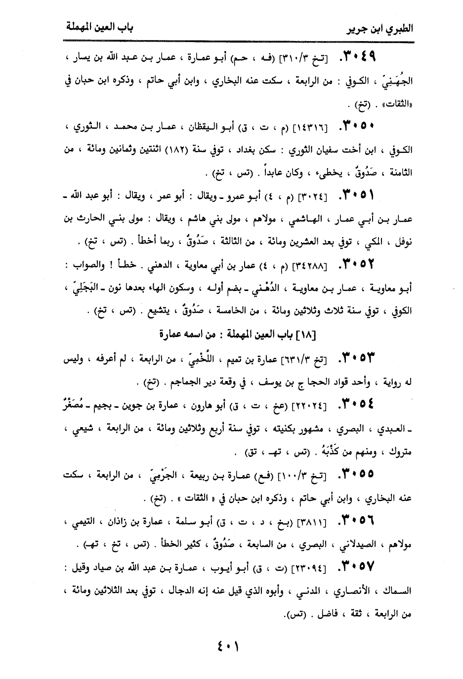 3053 - [تخ 3/ 631] عمارة بن تميم، اللخمي، من الرابعة، لم أعرفه، وليس له رواية، وأحد قواد الحجاج بن يوسف في وقعة دير الجماجم. (تخ).
