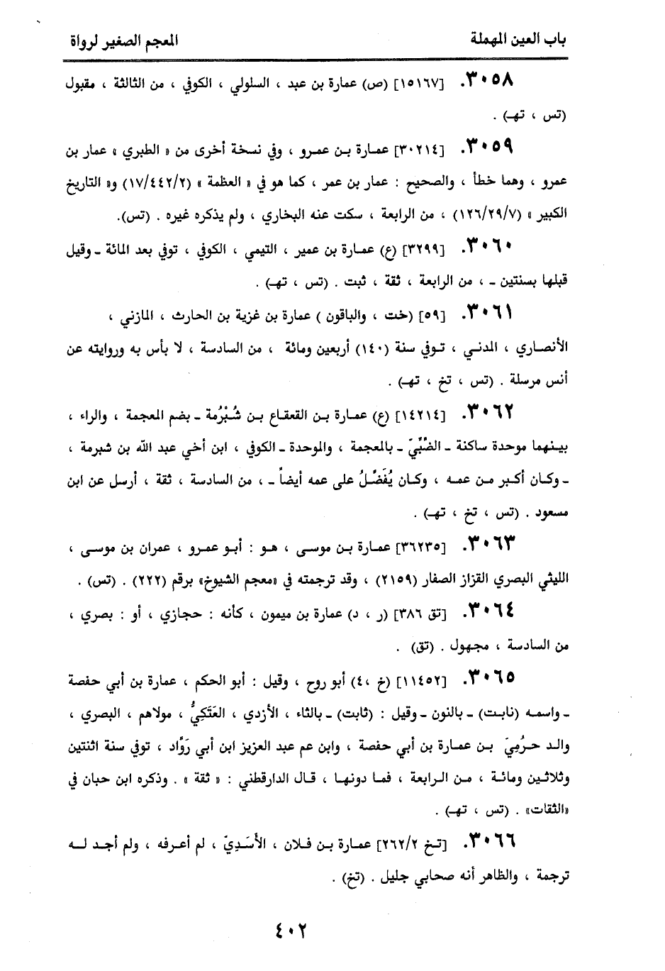 3059 - [30214] عمارة بن عمرو، وفي نسخة أخرى من " الطبري " عمار بن عمرو، وهما خطأ، والصحيح: عمار بن عمر، كما هو في " العظمة " (2/ 442\ 17) و " التاريخ الكبير " (7/ 29\ 126)، من الرابعة، سكت عنه البخاري، ولم يذكره غيره. (تس).