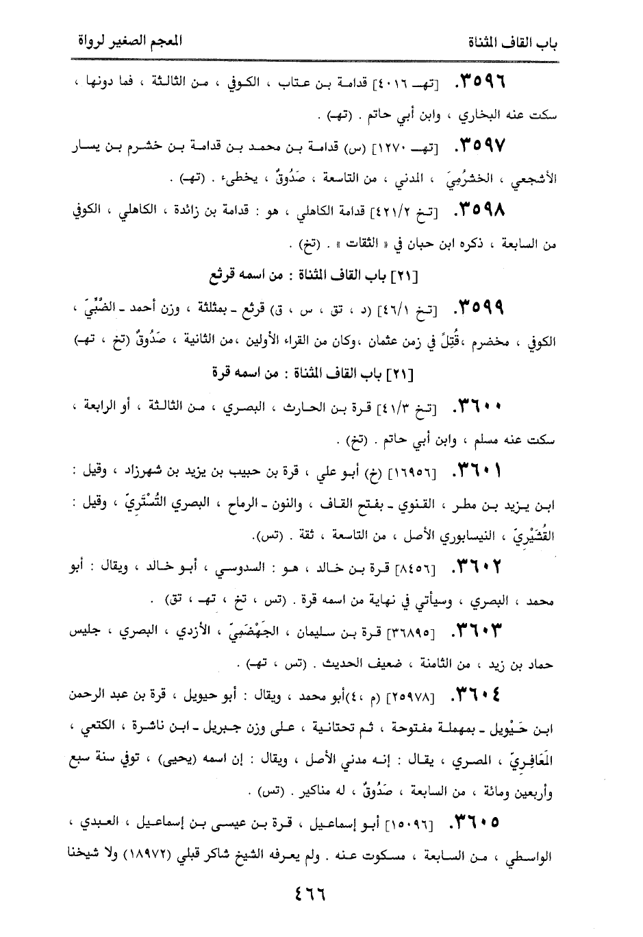 3596. [تهـ 4016] قدامة بن عتاب، الكوفي، من الثالثة، فما دونها، سكت عنه البخاري، وابن أبي حاتم. (تهـ).