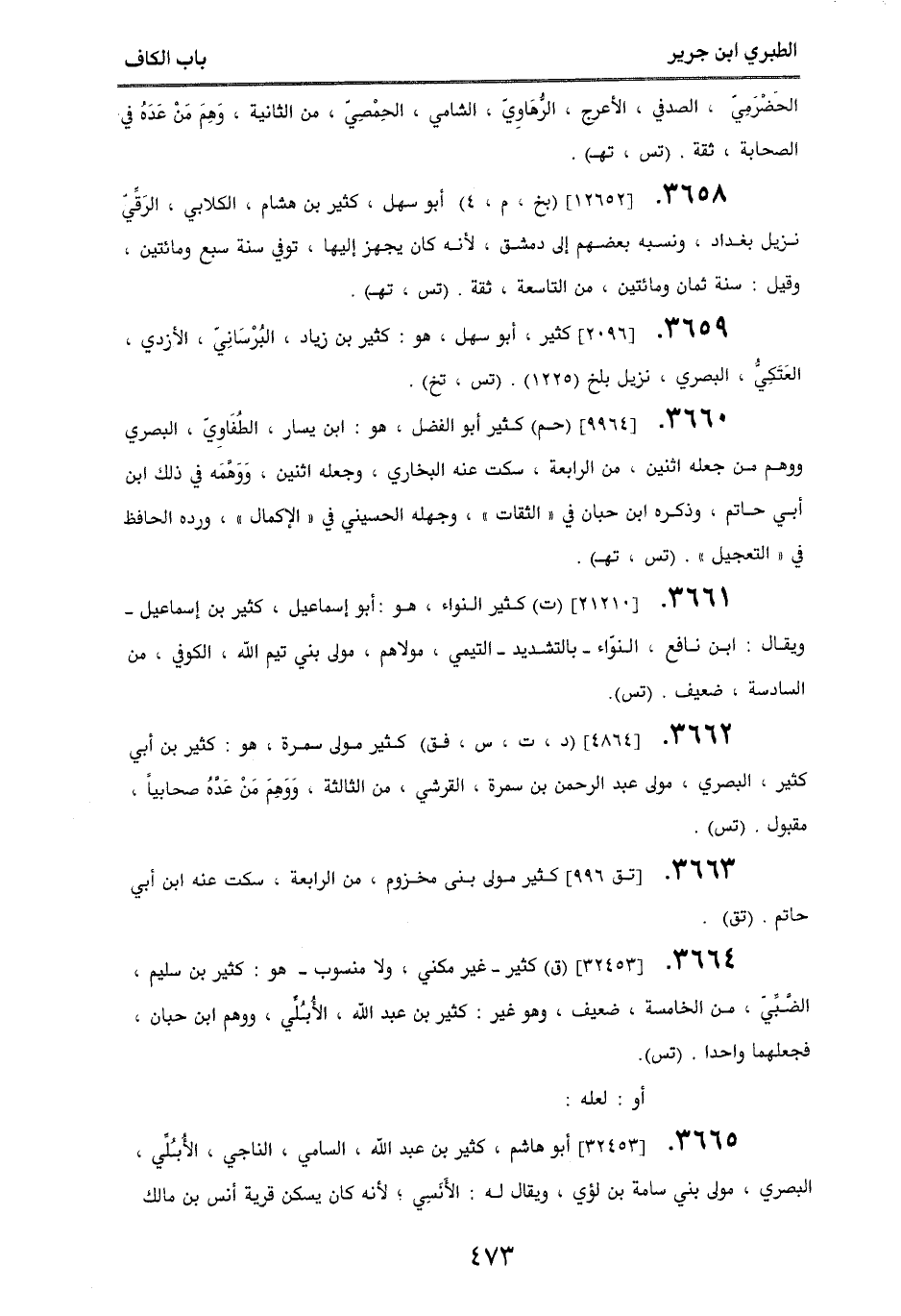 3659. [2096] كثير، أبو سهل، هو: كثير بن زياد، البُرسَانِيّ، الأزدي، العَتَكِيُّ، البصري، نزيل بلخ (1225). (تس، تخ).