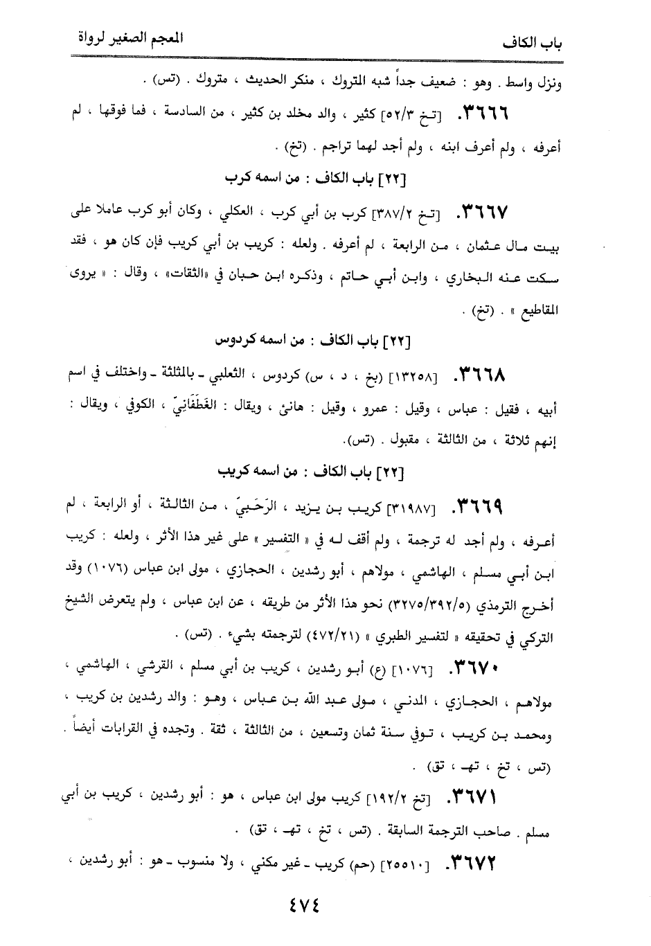 3671. [تخ 2/ 192] كريب مولى ابن عباس، هو: أبو رشدين، كريب بن أبي مسلم، صاحب الترجمة السابقة. (تس، تخ، تهـ، تق).