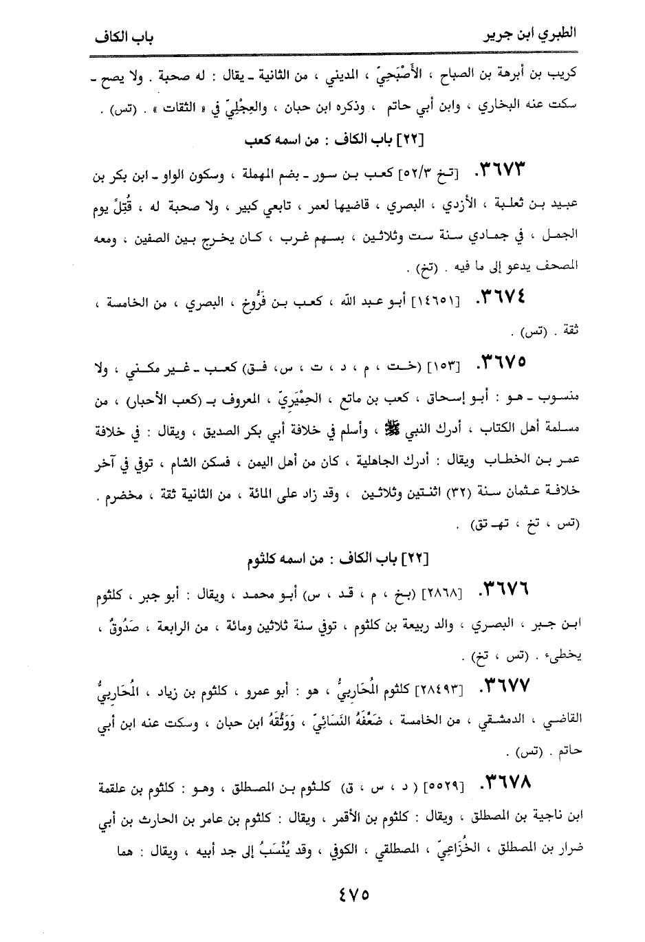 3675. [153] (خت، م، د، ت، س، فق) كعب - غير مكني، ولا منسوب - هو: أبو إسحاق، كعب بن ماتع، الحِميَرِيّ، المعروف بـ (كعب الأحبار)، من مسلمة أهل الكتاب، أدرك النبي - صلى الله عليه وسلم - وأسلم في خلافة أبي بكر الصديق، ويقال: في خلافة عمر بن الخطاب، ويقال: أدرك الجاهلية، كان من أهل اليمن، فسكن الشام، توفي في آخر خلافة عثمان سنة (32) اثنتين وثلاثين، وقد زاد على المائة، من الثانية ثقة، مخضرم. (تس، تخ، تهـ، تق).