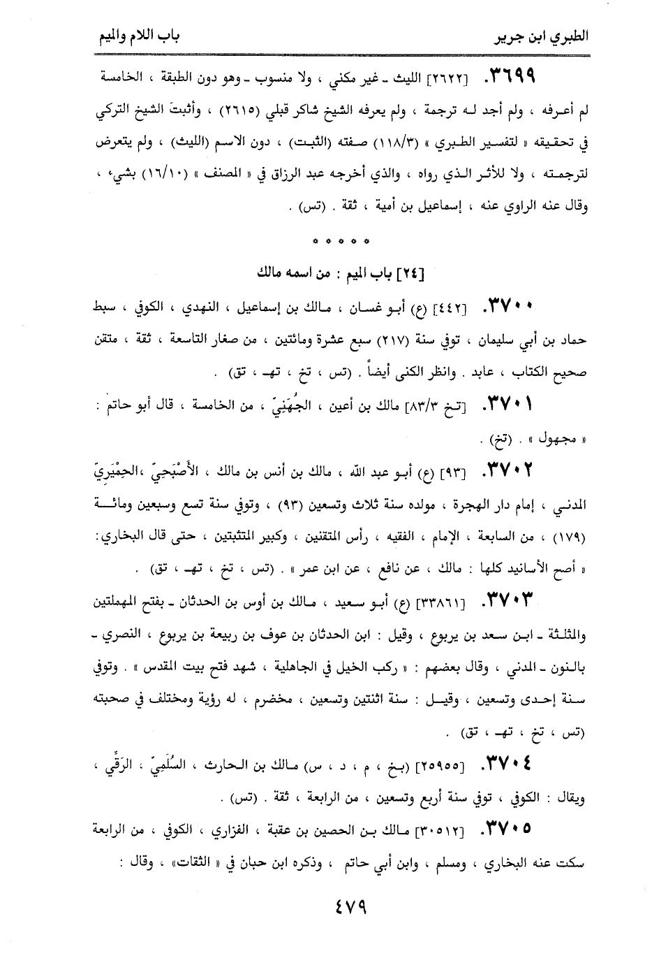 3702. [93] (ع) أبو عبد الله، مالك بن أنس بن مالك، الأصبَحِيّ، الحِميَرِيّ، المدني، إمام دار الهجرة، مولده سنة ثلاث وتسعين (93)، وتوفي سنة تسع وسبعين ومائة (179)، من السابعة، الإمام، الفقيه، رأس المتقنين، وكبير المتثبتين، حتى قال البخاري: ((أصح الأسانيد كلها: مالك، عن نافع، عن ابن عمر)). (تس، تخ، تهـ، تق).