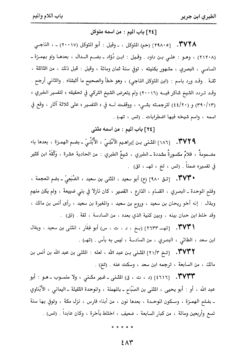 3729. [186] المثنى بن إبراهيم الآمُلِيّ، الأُبُلِّيّ - بضم الهمزة، بعدها باء مضمومةٌ، فلامٌ مكسورةٌ مشددة - الطبري، شيخُ الطبري: من الحادية عشرة، وَثَّقّهُ ابن كثير في تفسيره ضمنًا. (تس، تخ، تهـ، تق).