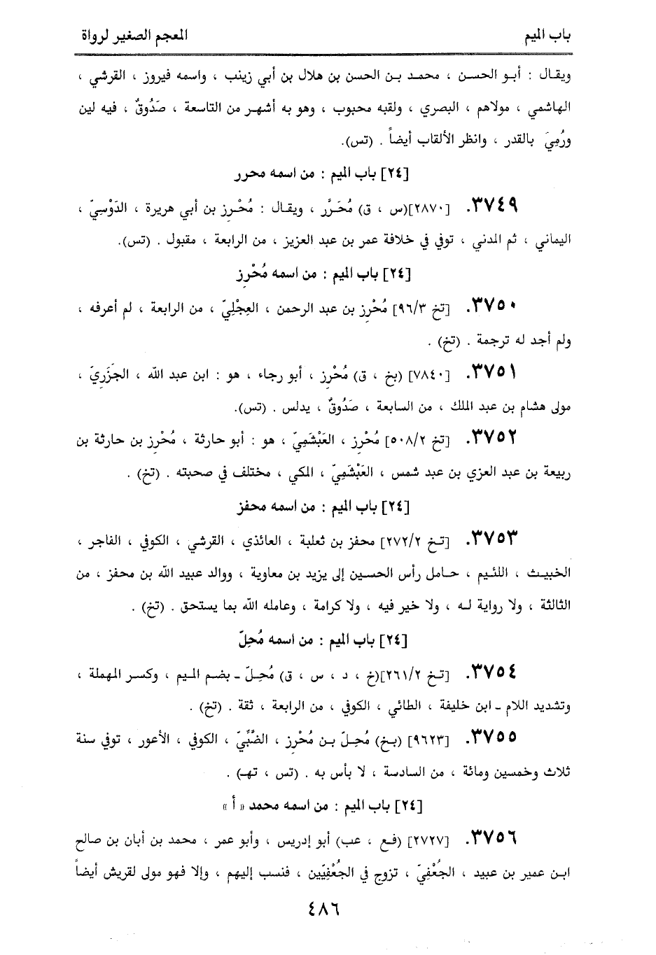 3750. [تخ 3/ 96] مُحرِز بن عبد الرحمن، العِجلِيّ، من الرابعة، لم أعرفه، ولم أجد له ترجمة. (تخ).
