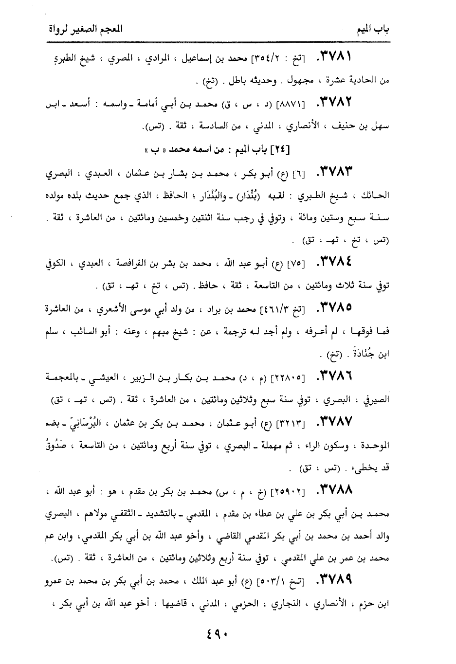3783. [6] (ع) أبو بكر، محمد بن بشار بن عثمان، العبدي، البصري الحائك، شيخ الطبري: لقبه (بُندَار) - والبُندَار، الحافظ، الذي جمع حديث بلده مولده سنة سبع وستين ومائة، وتوفي في رجب سنة اثنتين وخمسين ومائتين، من العاشرة، ثقة. (تس، تخ، تهـ، تق).