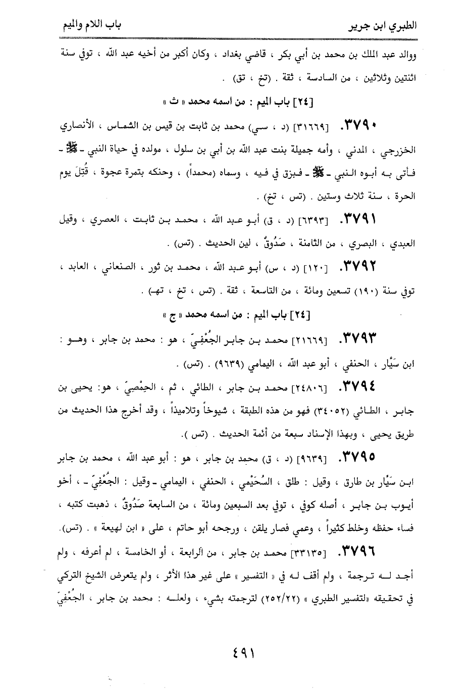 3796. [33135] محمد بن جابر، من الرابعة، أو الخامسة، لم أعرفه، ولم أجد له ترجمة، ولم أقف له في ((التفسير)) على غير هذا الأثر، ولم يتعرض الشيخ التركي في تحقيقه ((لتفسير الطبري)) (22/ 252) لترجمته بشيء، ولعله محمد بن جابر، الجُعفِيّ