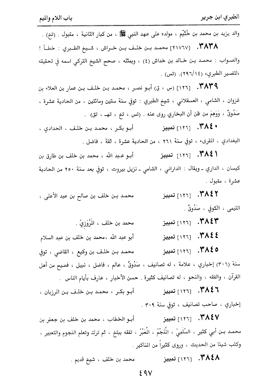 3838. [21767] محمد بن خلف بن خراش، شيخ الطبري: خطأ! والصواب: محمد بن خالد بن خداش (4)، وبمثله، صحح الشيخ التركي اسمه في تحقيقه ((لتفسير الطبري)) (14/ 296). (تس).