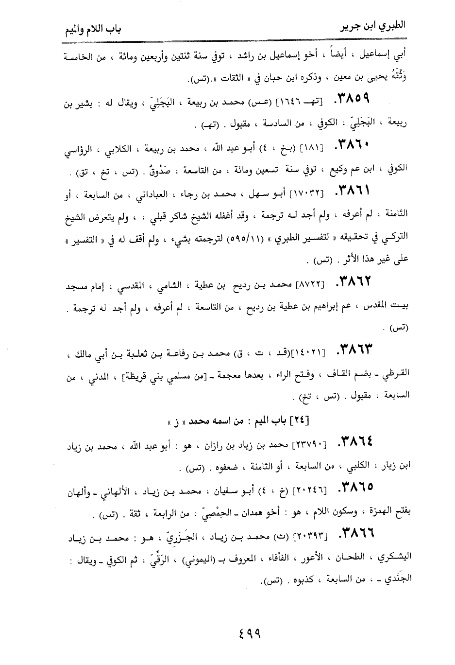 3861. [17032] أبو سهل، محمد بن رجاء، العباداني، من السابعة، أو الثامنة، لم أعرفه، ولم أجد له ترجمة، وقد أغفله الشيخ شاكر قبلي، ولم يتعرض الشيخ التركي في تحقيقه ((لتفسير الطبري)) (11/ 595) لترجمته بشيء، لم أقف له في ((التفسير)) على غير هذا الأثر. (تس).