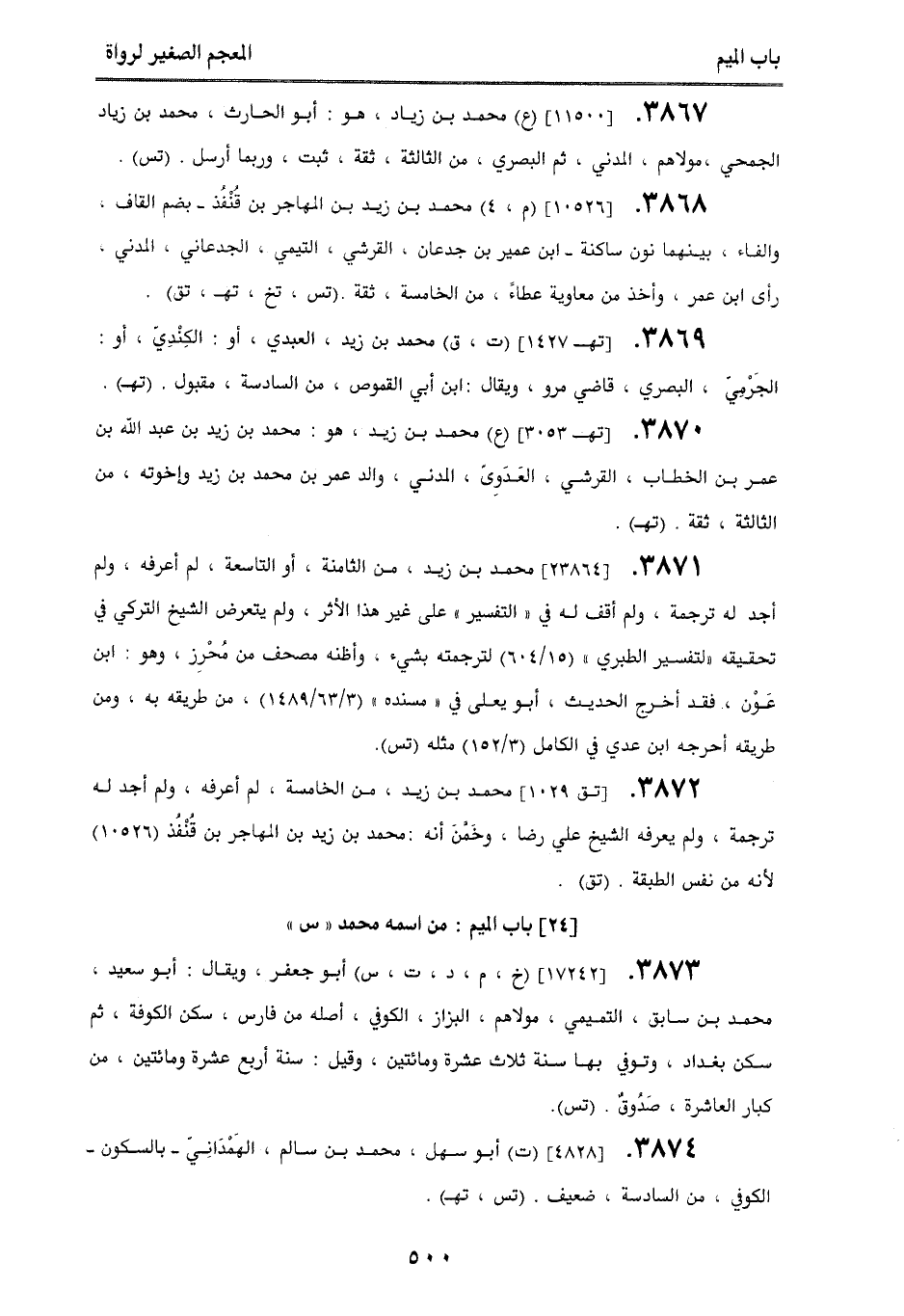 3872. [تق 1029] محمد بن زيد، من الخامسة، لم أعرفه، ولم أجد له ترجمة، ولم يعرفه الشيخ علي رضا، وخَمنَ أنه: محمد بن زيد بن المهاجر بن قُنفُذ (10526) لأنه من نفس الطبقة. (تق).