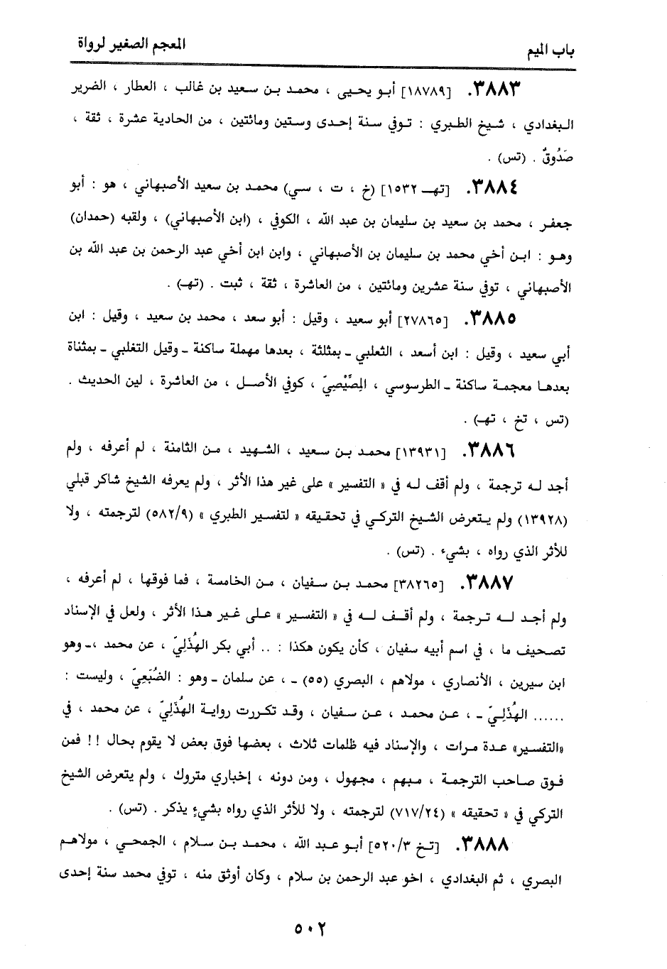 3884. [تهـ 1532] (خ، ت، سي) محمد بن سعيد الأصبهاني، هو: أبو جعفر، محمد بن سعيد بن عبد الله، الكوفي، (ابن الأصبهاني) ولقبه (حمدان) وهو: ابن أخي محمد بن سليمان بن الأصبهاني، وابن ابن أخي عبد الرحمن بن عبد الله بن الأصبهاني، توفي سنة عشرين ومائتين، من العاشرة، ثقة، ثبت. (تهـ).
