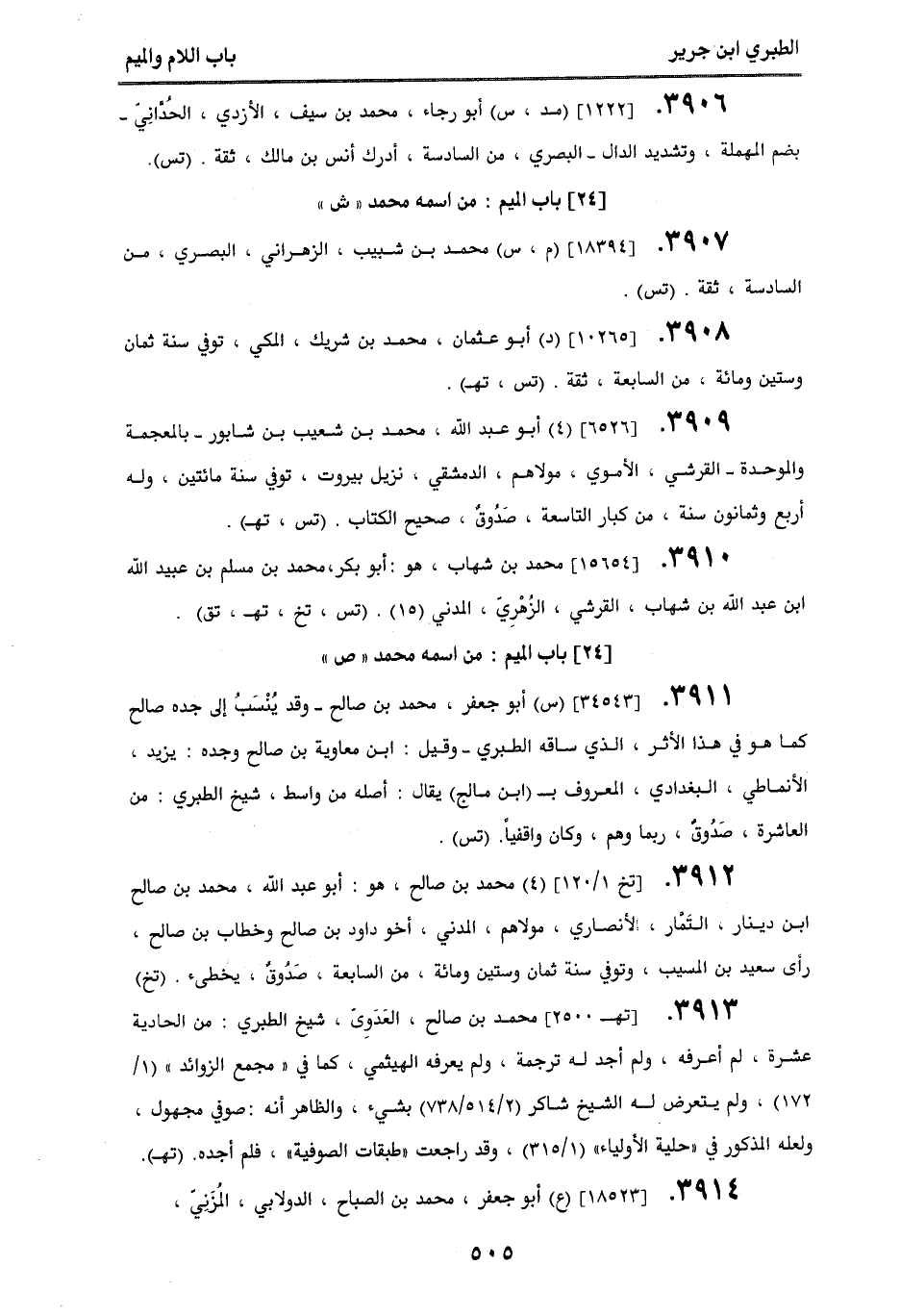 3911. [34543] (س) أبو جعفر، محمد بن صالح - وقد يُنسَبُ إلى جده صالح كما هو في هذا الأثر، الذي ساقه الطبري - وقيل: ابن معاوية بن صالح وجده: يزيد، الأنماطي، البغدادي، المعروف بـ (ابن مالج) يقال: أصله من واسط، شيخ الطبري: من العاشرة، صَدُوقٌ، ربما وهم، وكان واقفيًا. (تس).
